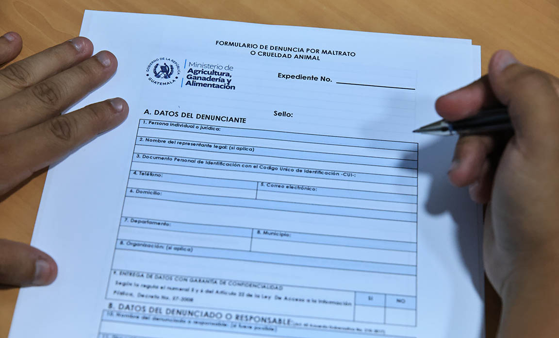 Las denuncias pueden realizarse directamente ante la UBA, presentarse en la Policía Nacional Civil (PNC) o en la municipalidad correspondiente. También está habilitada la opción de enviar la documentación por correo electrónico a denunciasbienestaranimal@maga.gob.gt. Para ello, se deben adjuntar los siguientes documentos: