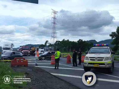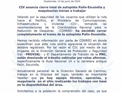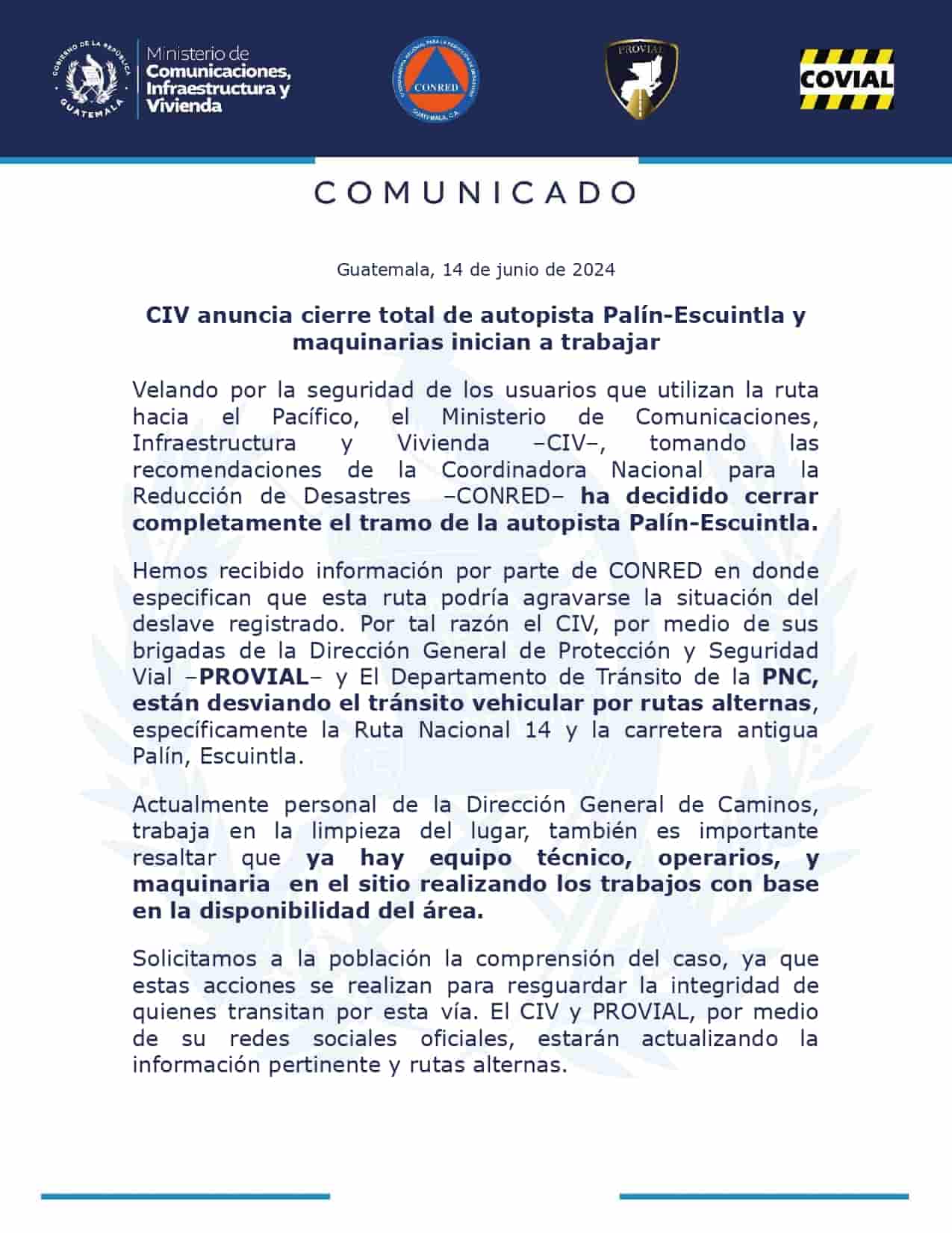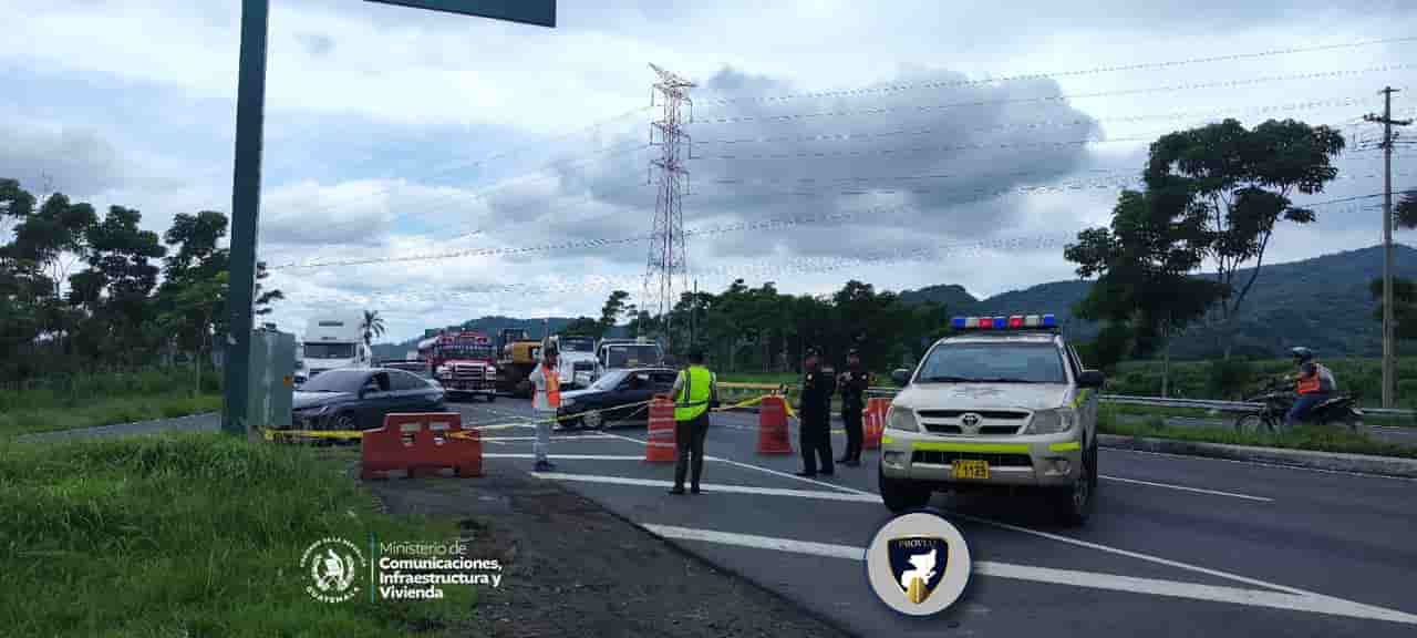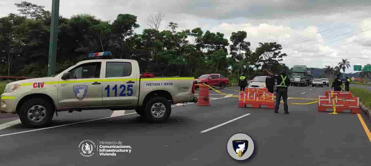 Velando por la seguridad de los usuarios que utilizan la ruta hacia el Pacífico, el Ministerio de Comunicaciones, Infraestructura y Vivienda –CIV–, tomando las recomendaciones de la Coordinadora Nacional para la Reducción de Desastres –CONRED– ha decidido cerrar completamente el tramo de la autopista Palín-Escuintla.