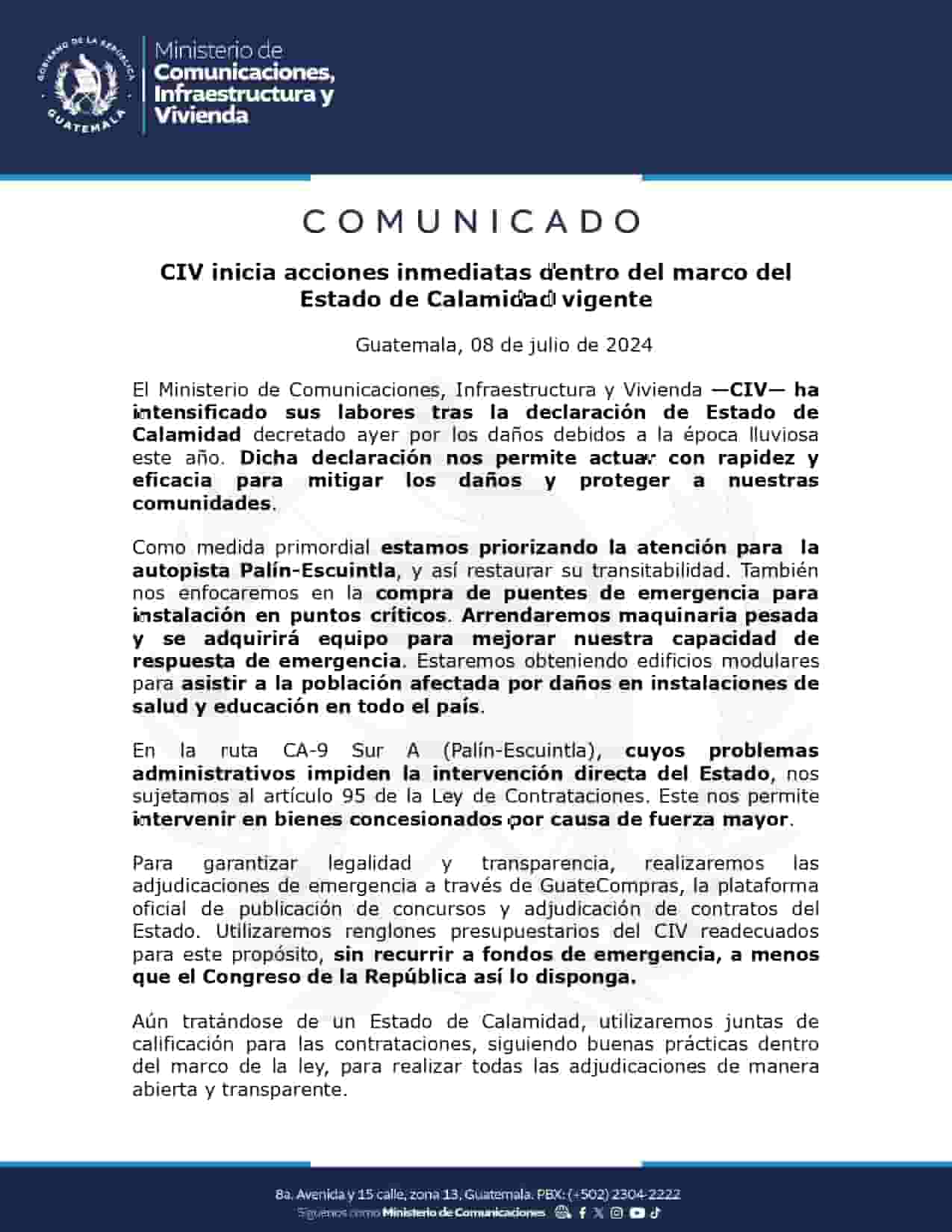 Como medida primordial estamos priorizando la atención para la autopista Palín-Escuintla, y así restaurar su transitabilidad. También nos enfocaremos en la compra de puentes de emergencia para instalación en puntos críticos. Arrendaremos maquinaria pesada y se adquirirá equipo para mejorar nuestra capacidad de respuesta de emergencia. Estaremos obteniendo edificios modulares para asistir a la población afectada por daños en instalaciones de salud y educación en todo el país.
