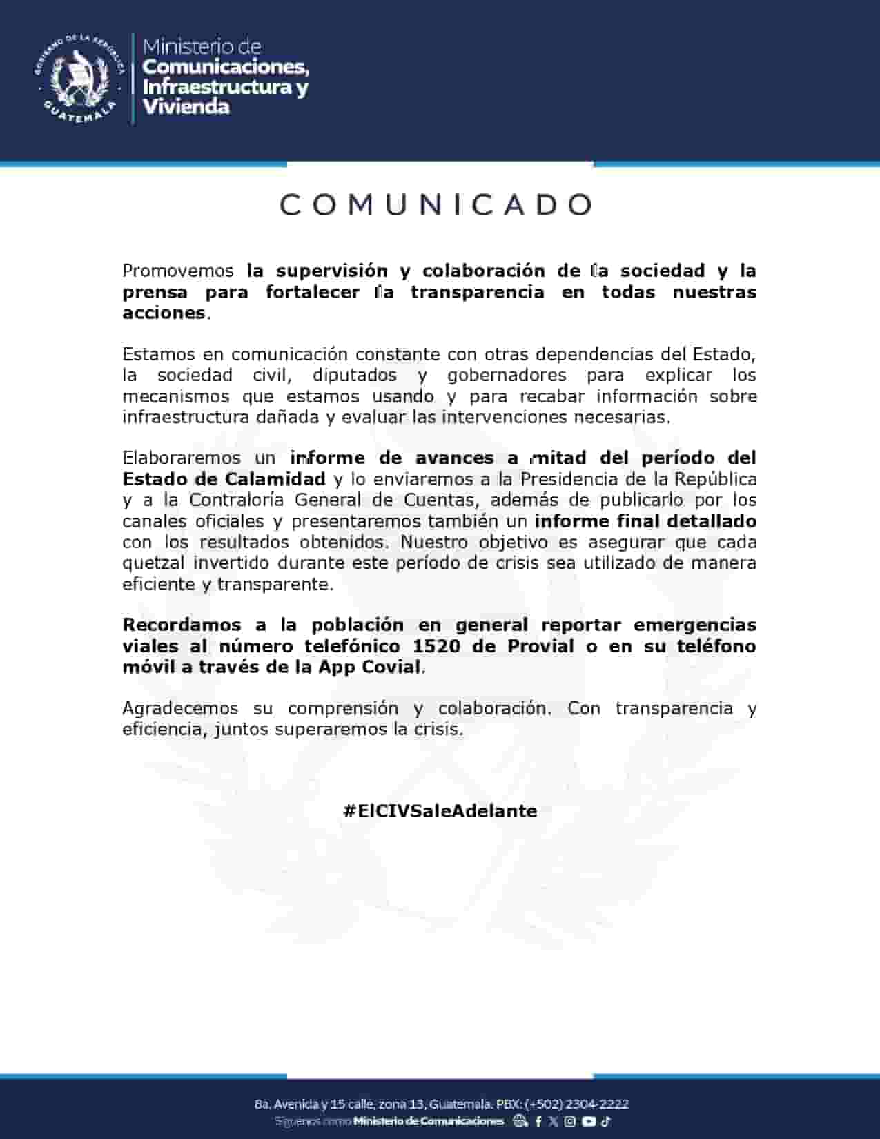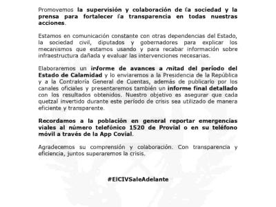 Elaboraremos un informe de avances a mitad del período del Estado de Calamidad y lo enviaremos a la Presidencia de la República y a la Contraloría General de Cuentas, además de publicarlo por los canales oficiales y presentaremos también un informe final detallado con los resultados obtenidos. Nuestro objetivo es asegurar que cada quetzal invertido durante este período de crisis sea utilizado de manera eficiente y transparente.