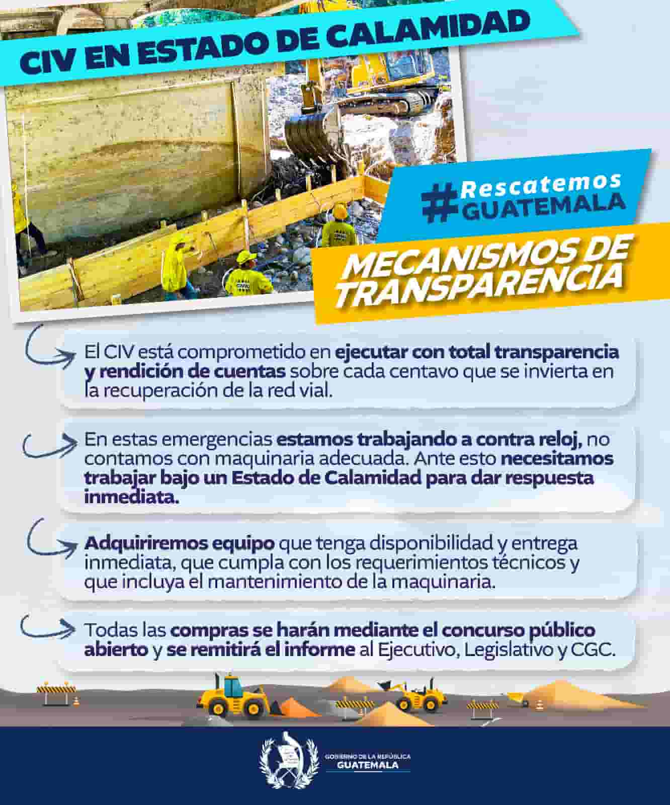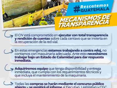 Para garantizar legalidad y transparencia, realizaremos las adjudicaciones de emergencia a través de GuateCompras, la plataforma oficial de publicación de concursos y adjudicación de contratos del Estado. Utilizaremos renglones presupuestarios del CIV readecuados para este propósito, sin recurrir a fondos de emergencia, a menos que el Congreso de la República así lo disponga.
