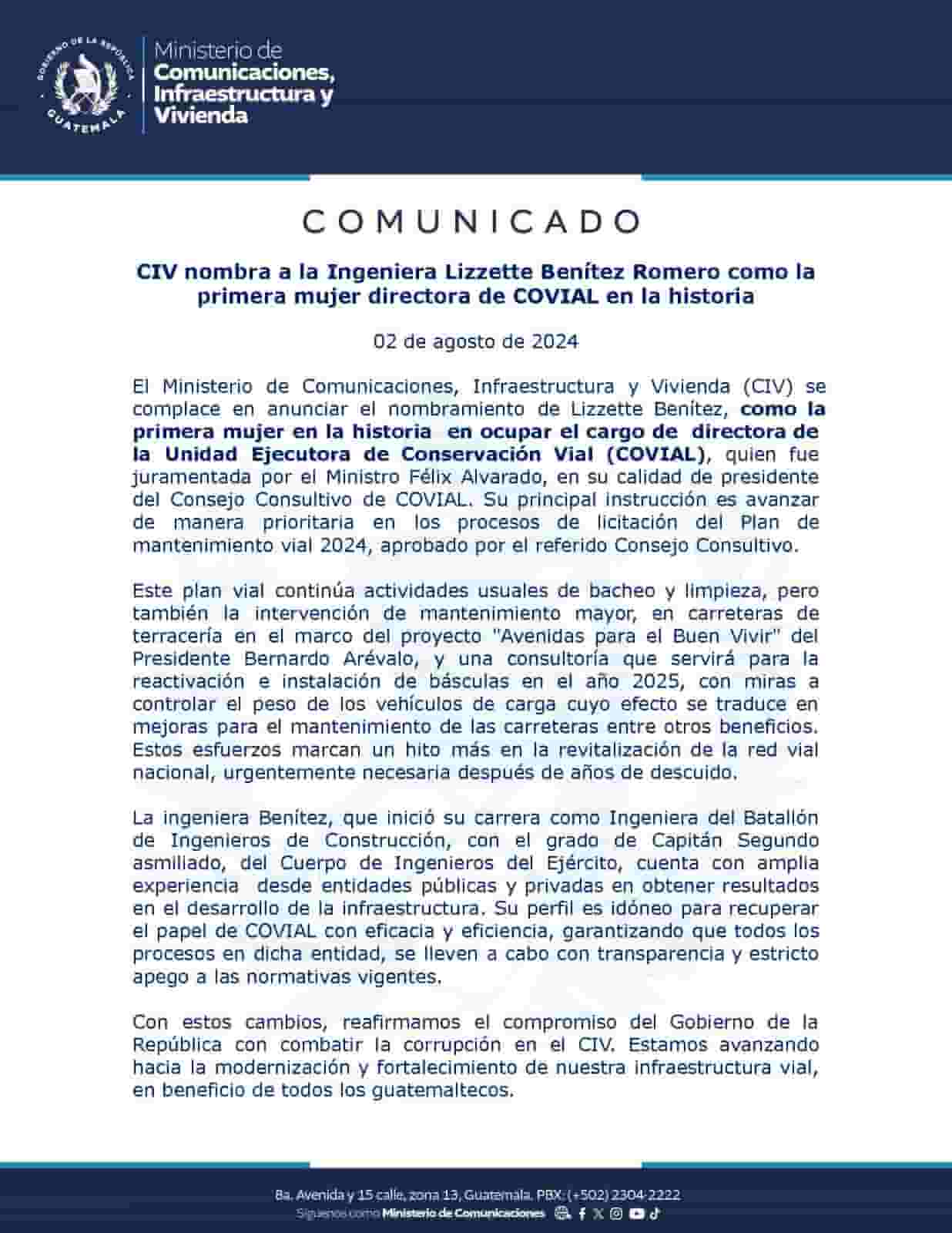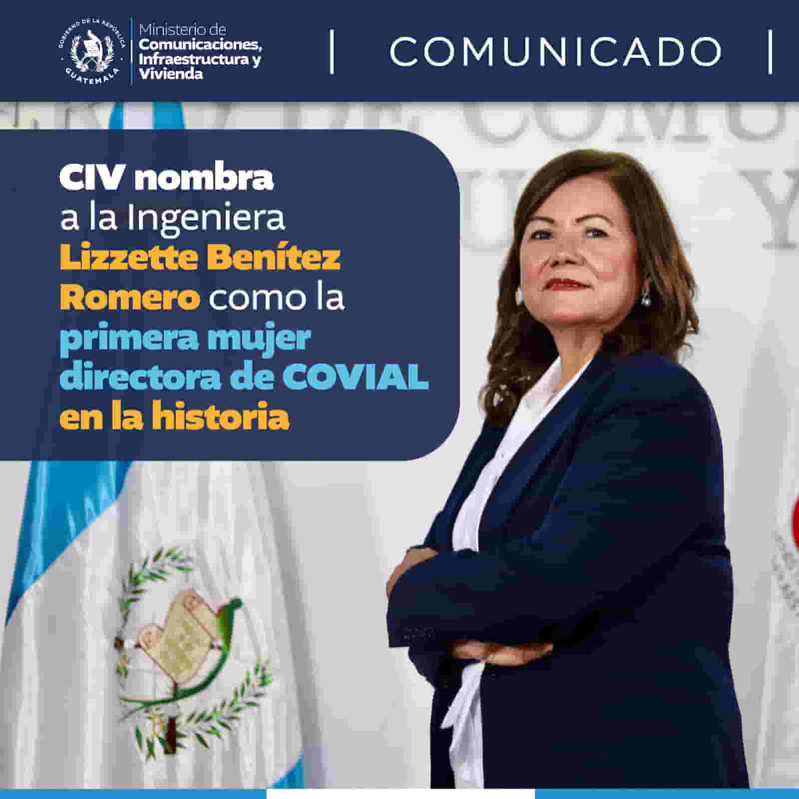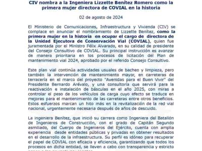 El Ministerio de Comunicaciones, Infraestructura y Vivienda (CIV) se complace en anunciar el nombramiento de Lizzette Benítez, como la primera mujer en la historia en ocupar el cargo de directora de la Unidad Ejecutora de Conservación Vial (COVIAL), quien fue juramentada por el Ministro Félix Alvarado, en su calidad de presidente del Consejo Consultivo de COVIAL. Su principal instrucción es avanzar de manera prioritaria en los procesos de licitación del Plan de mantenimiento vial 2024, aprobado por el referido Consejo Consultivo.