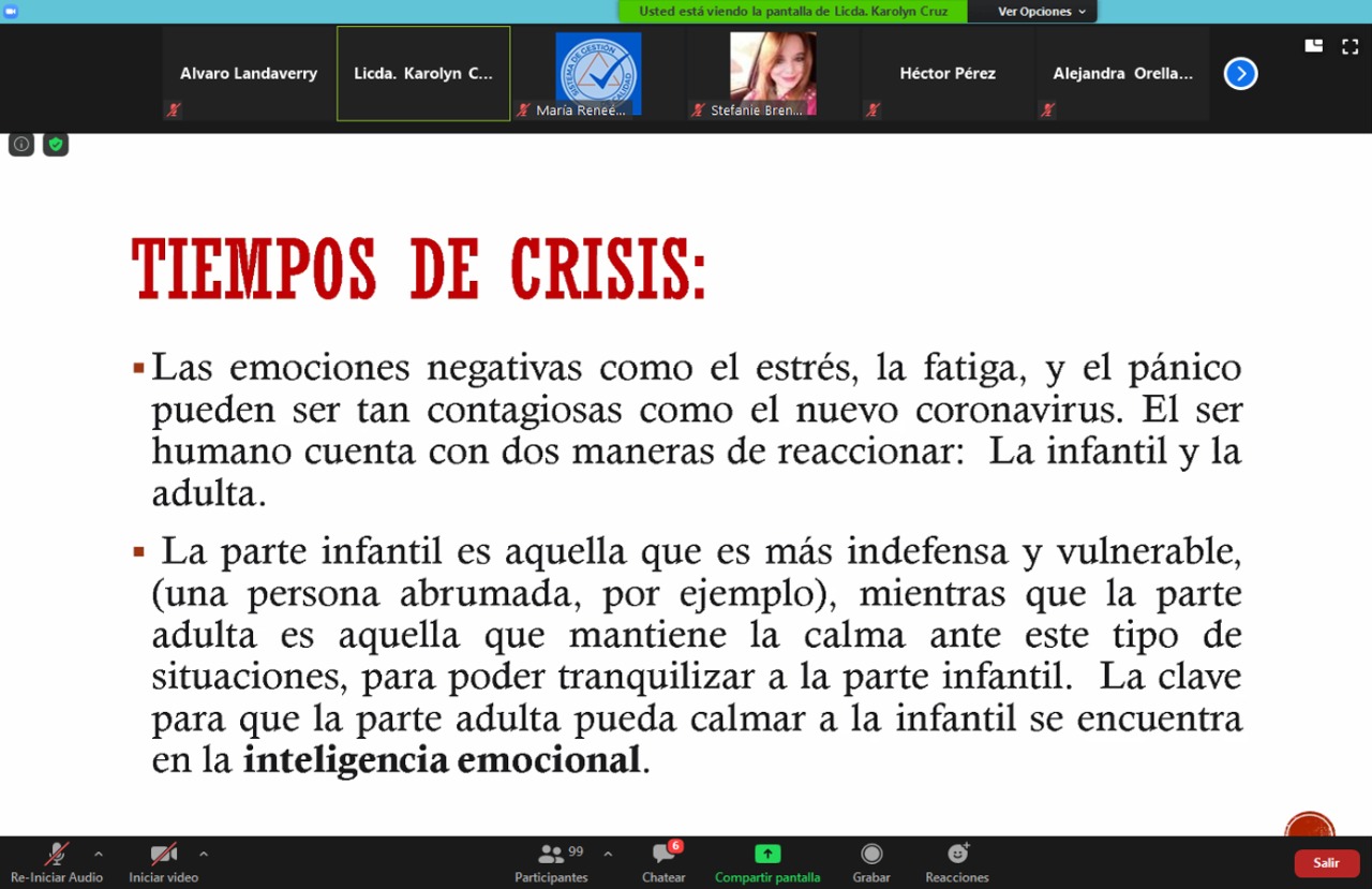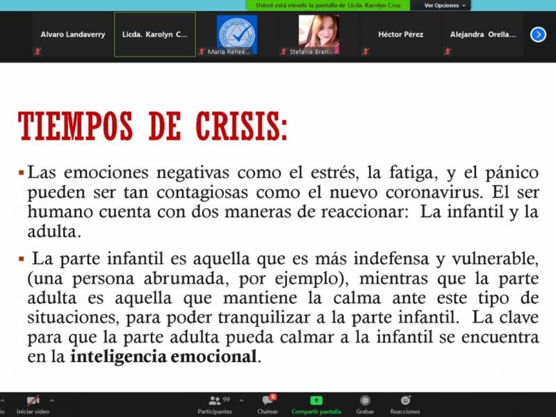 Con el propósito de mejorar el clima laboral e incrementar la productividad, colaboradores de la Secretaría Ejecutiva de la Coordinadora Nacional para la Reducción de Desastres -SE-CONRED- recibieron la mañana del miércoles 4 de agosto el taller virtual “Inteligencia emocional en tiempos de crisis”.