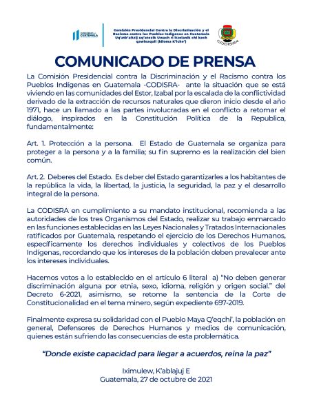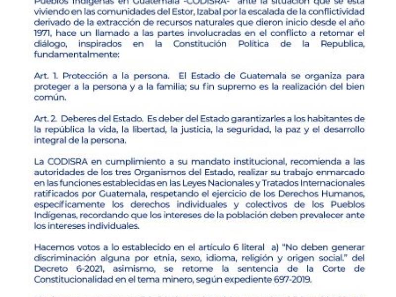 Comunicado, ante los acontecimientos ocurridos en El Estor, Izabal.