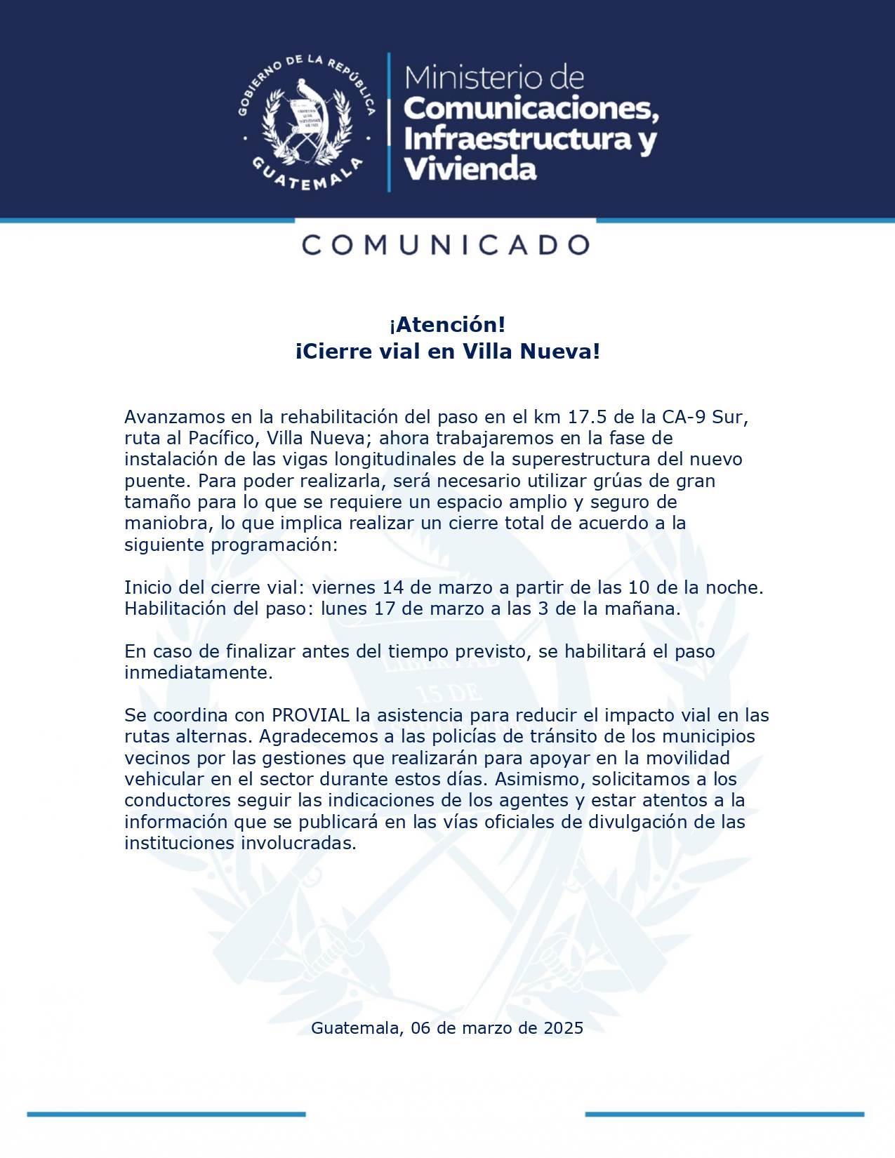 Avanzamos en la rehabilitación del paso en el km 17.5 de la CA-9 Sur, ruta al Pacífico, Villa Nueva; ahora trabajaremos en la fase de instalación de las vigas longitudinales de la superestructura del nuevo puente. Para poder realizarla, será necesario utilizar grúas de gran tamaño y en consecuencia tener un espacio amplio y seguro de maniobra, esto implica realizar un cierre total de acuerdo a la siguiente programación:
