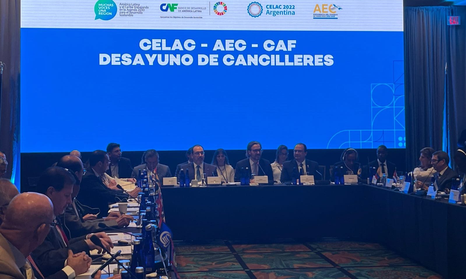 En el marco de la primera reunión conjunta CELAC-AEC, las y los Ministros de Relaciones Exteriores, manifestaron que ante la coyuntura global es importante fortalecer el diálogo e identificar ejes transversales que permitan potenciar la agenda regional y enfrentar conjuntamente los retos existentes en materia de reactivación pospandemia y recuperación socioeconómica inclusiva y sostenible; acceso a fuentes de financiamiento para el desarrollo; los graves efectos del cambio climático; las amenazas a la paz y la seguridad internacionales; el rol central de la ciencia, la tecnología y la innovación para el crecimiento económico; la gestión integral del riesgo de desastres; la importancia de la cultura y la educación para el bienestar integral de nuestros pueblos; y la implementación de agendas para el desarrollo sostenible de la región.
