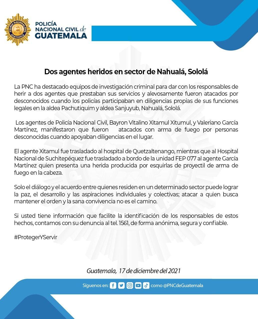 Comunicado: Dos agentes heridos en sector de Nahualá, Sololá