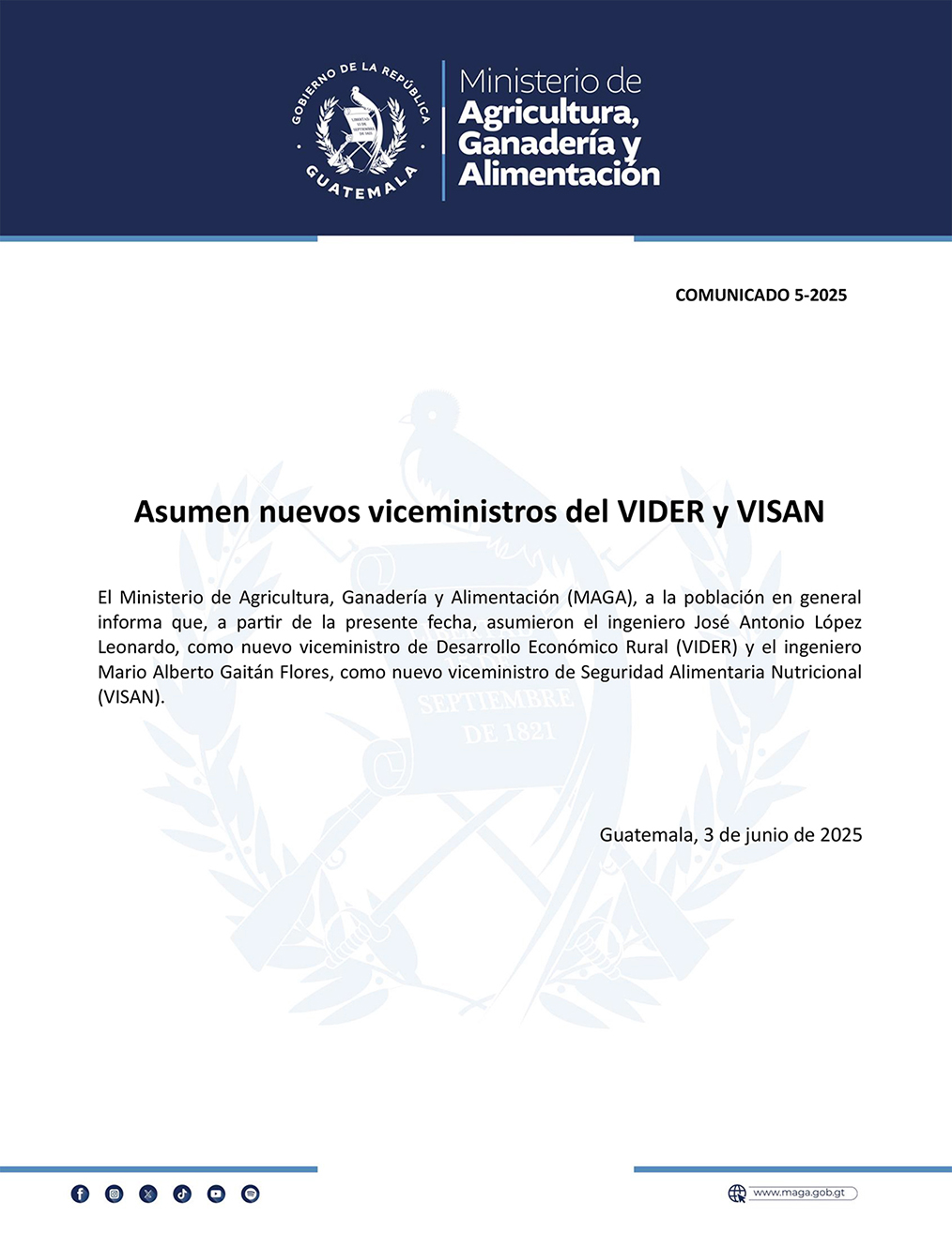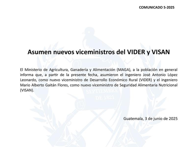 Comunicado No. 5 / Asumen nuevos viceministros del VIDER y VISAN