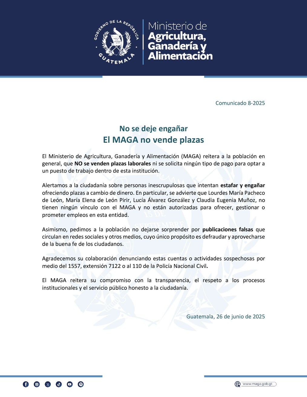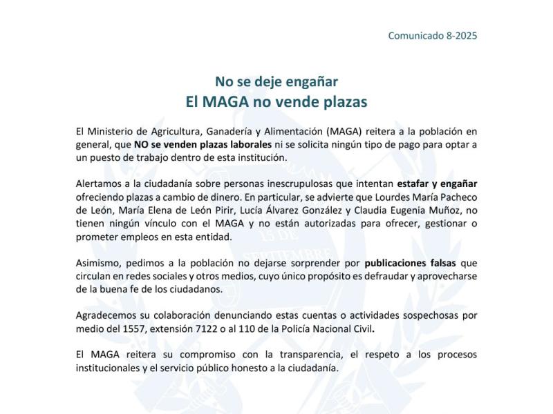 Comunicado No. 8 - No se deje engañar. El MAGA no vende plazas