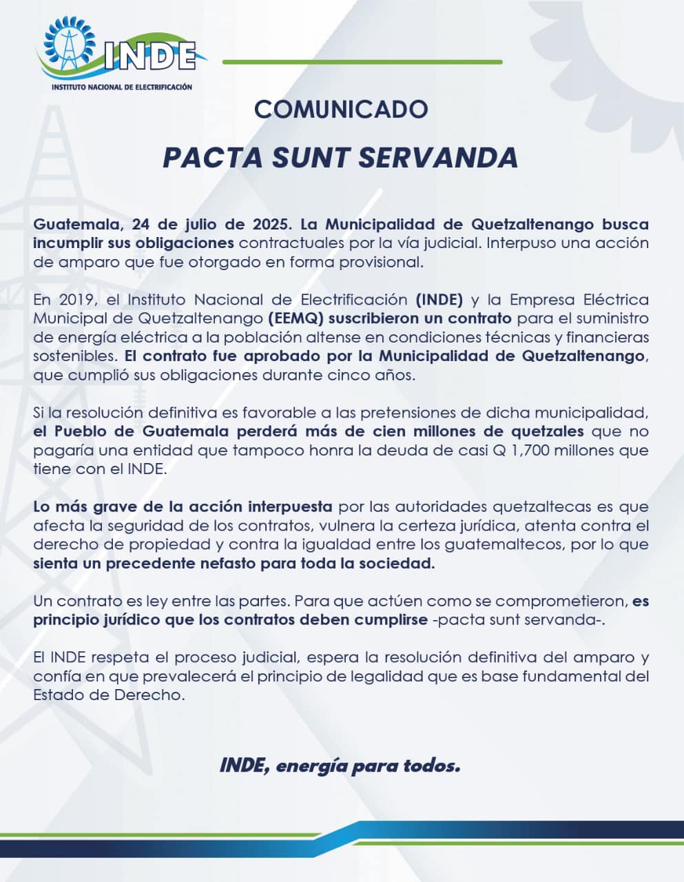 Si la resolución definitiva es favorable a las pretensiones de dicha municipalidad, el pueblo de Guatemala perderá más de Q100 millones que no pagaría una entidad que tampoco honra la deuda de casi Q1,700 millones que tiene con el INDE.