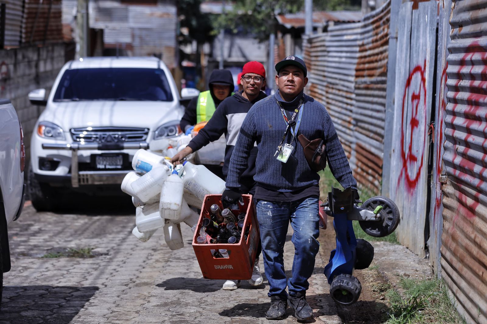 Desde muy temprano los vecinos de comunidades de Mixco escucharon un megáfono invitando a sacar objetos en desuso, chatarra, llantas, envases plásticos y de vidrio, entre otros, como parte de la intensificación de acciones para prevenir criaderos de zancudos y juntos combatir el dengue.