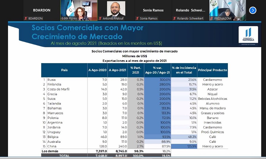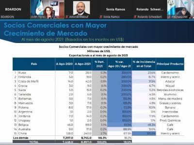En cuanto a los socios comerciales con mayor crecimiento a agosto de este año, basados en el valor de las exportaciones, Rusia figura como el mayor, con un crecimiento del 300 por ciento en donde el principal producto que comercia con Guatemala es el cardamomo. Sigue Finlandia con 280 por ciento de crecimiento, siendo el hierro y el acero el producto principal. En tercer lugar se ubica Costa de Marfil, con un aumento del 200 por ciento y con el azúcar como el principal producto. Grecia, al igual que el país mencionado anteriormente, figura con 200 por ciento de crecimiento y el níquel como su principal producto. Al igual que los anteriores, Suiza, figura también con un 200 por ciento en crecimiento y en este caso el principal producto son las bebidas alcohólicas.