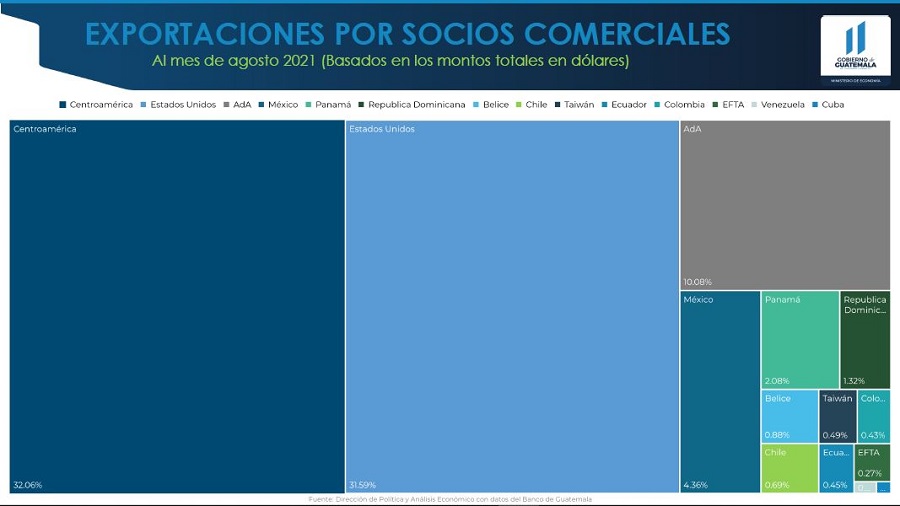 En cuanto a socios comerciales, Centroamérica continúa consolidando si posición como el primer lugar en el destino de las exportaciones de Guatemala, Estados Unidos como segundo lugar, los países de la Unión Europea como los terceros, mientras que el cuarto socio comercial de Guatemala es México y el quinto es Panamá. Según indicó la viceministra de Molina, Panamá se deja fuera de Centroamérica porque las condiciones en las que está integrado no son similares a las del resto de países centroamericanos pues aún está en un proceso de adhesión para tener las mismas condiciones del mercado centroamericano.