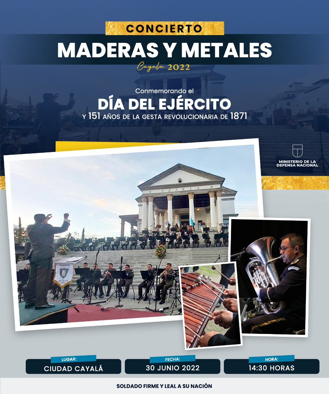 El concierto gratuito, organizado por el Ejército de Guatemala, en coordinación con Ciudad Cayalá, tendrá lugar este jueves 30 de junio desde las 14:30 horas. Un evento dedicado a los guatemaltecos, para conmemorar este día del Ejército de Guatemala y 151 aniversario de la Gesta Revolucionaria de 1871, que contará con la interpretación de los maestros de la Banda Sinfónica Marcial del Ejército de Guatemala, declarada Patrimonio Cultural de la Nación en el año 2004 y Marimbas de la Región Central del Ejército de Guatemala, en un ensamble musical que interpretará un repertorio especial.