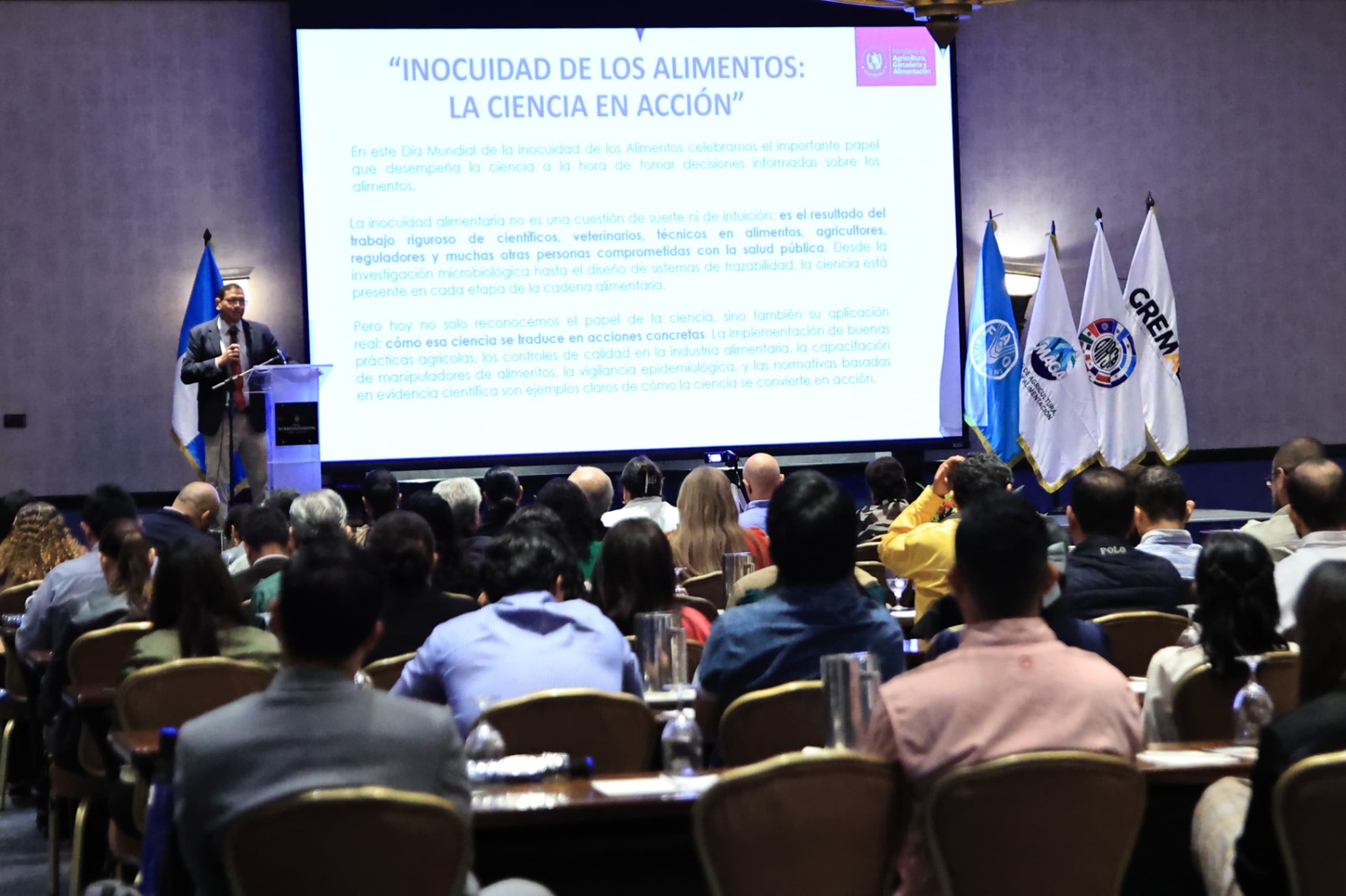 Ratificó el compromiso del Ministerio de Agricultura, Ganadería y Alimentación (MAGA) con una producción agroalimentaria segura, basada en evidencia científica. "El objetivo de las políticas públicas es poner la ciencia al servicio de la gente, porque cada avance en inocuidad alimentaria implica un avance en la salud, en desarrollo económico y en bienestar social", enfatizó Rivera.