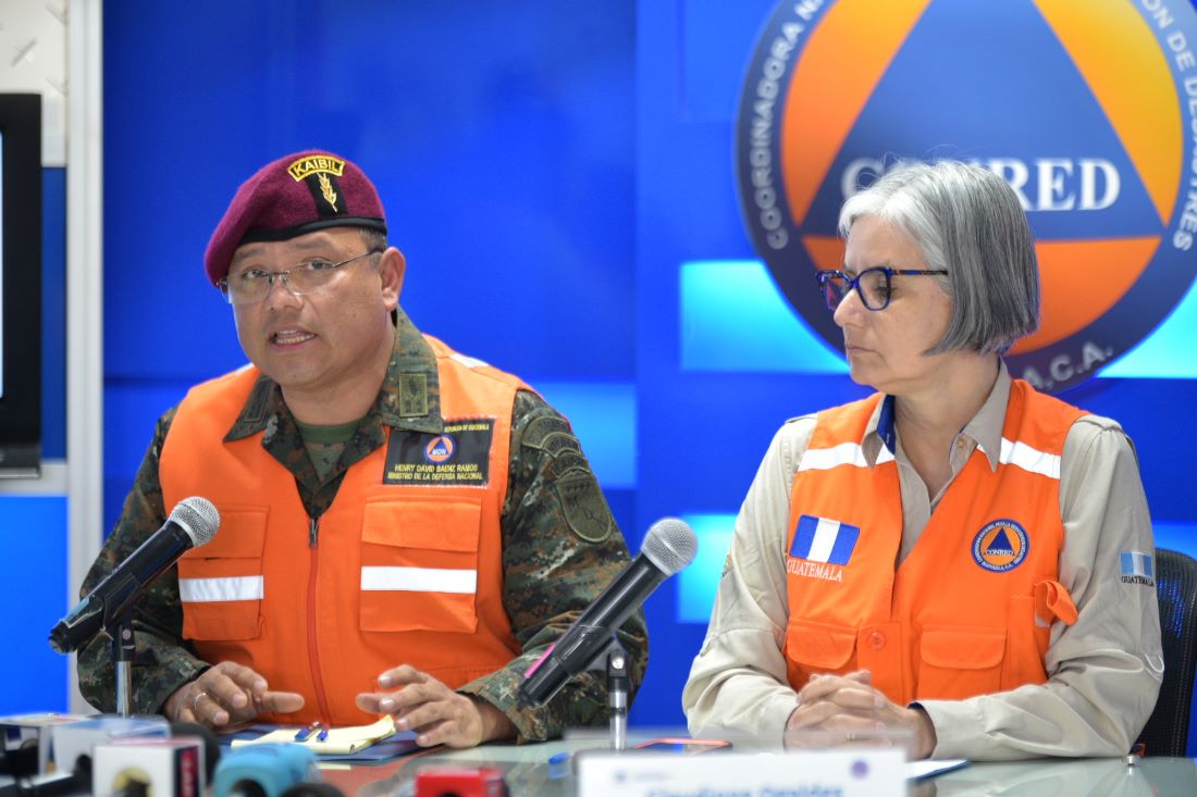 El Ministro de la Defensa Henry Sáenz y la Secretaria Ejecutiva de Conred Claudinne Ogaldes en conferencia de prensa por el incendio del vertedero AMSA, en el kilómetro 22 de la carretera hacia el Pacífico.
