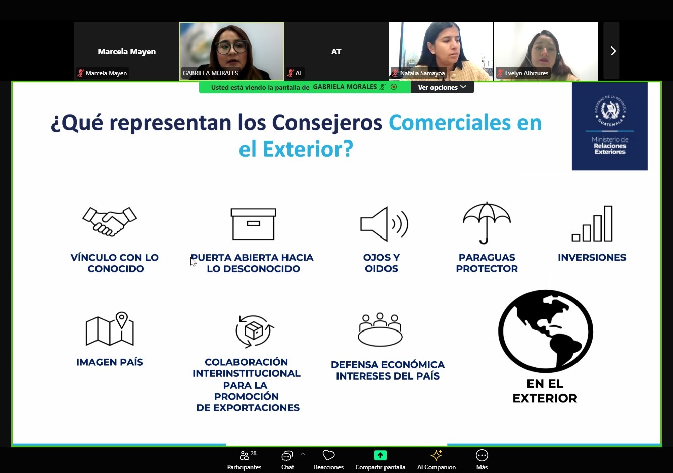 Guatemala, 6 de diciembre de 2024. Las Consejerías Comerciales de los Consulados Generales de Guatemala desarrollaron el conversatorio virtual "Perspectivas y tendencias del segmento de alimentos y bebidas en Estados Unidos", en apoyo a la Comisión de Alimentos y Bebidas de la Asociación de Exportadores de Guatemala (AGEXPORT), como parte de las acciones de diplomacia comercial que impulsa el Ministerio de Relaciones Exteriores (MINEX).