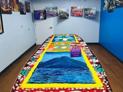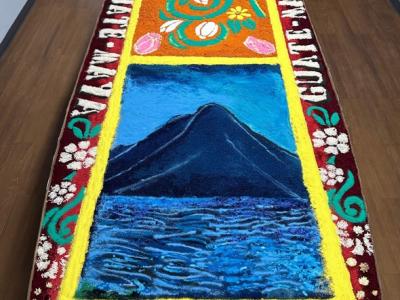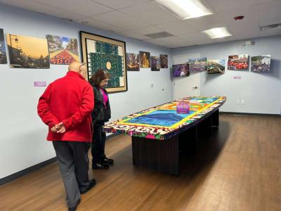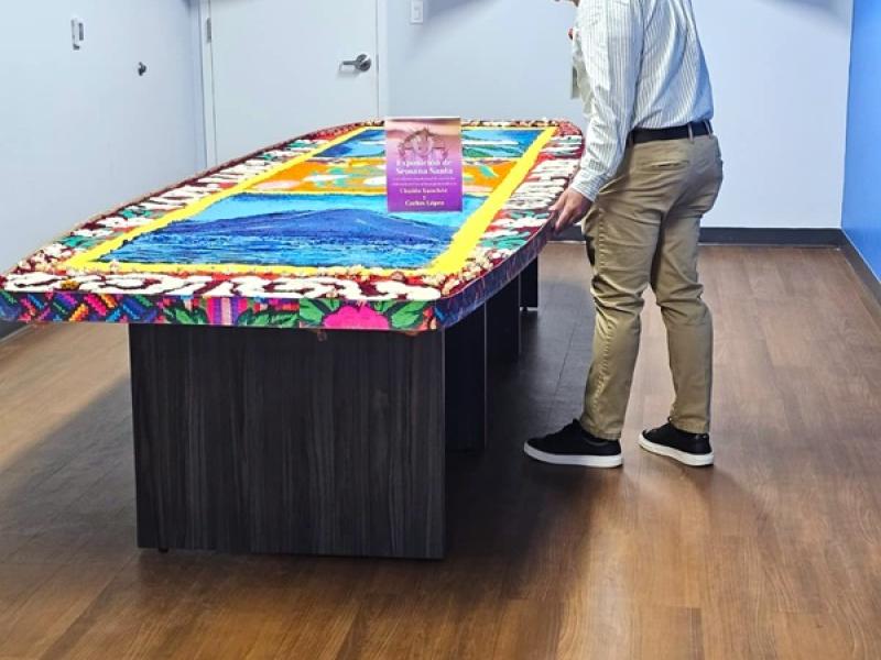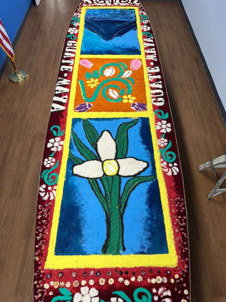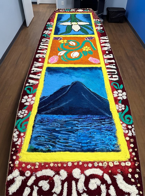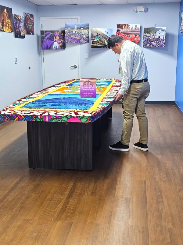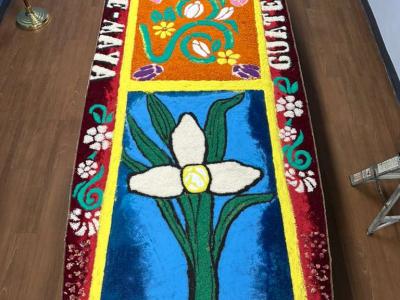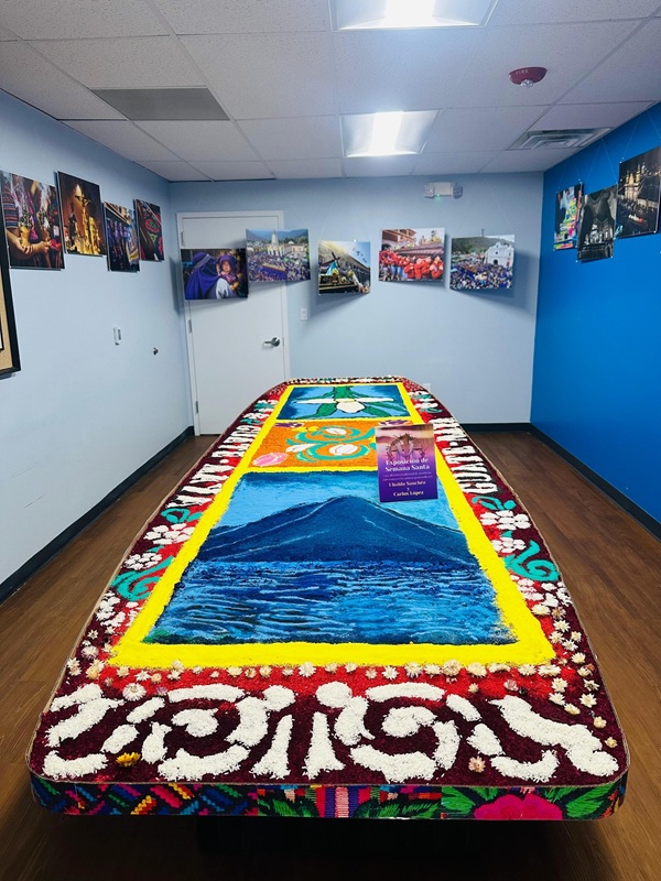 La muestra incluyó imágenes alusivas a la Semana Santa, marchas procesionales y una alfombra tradicional de aserrín elaborada por los artistas guatemaltecos Ubaldo Sánchez y Carlos López.