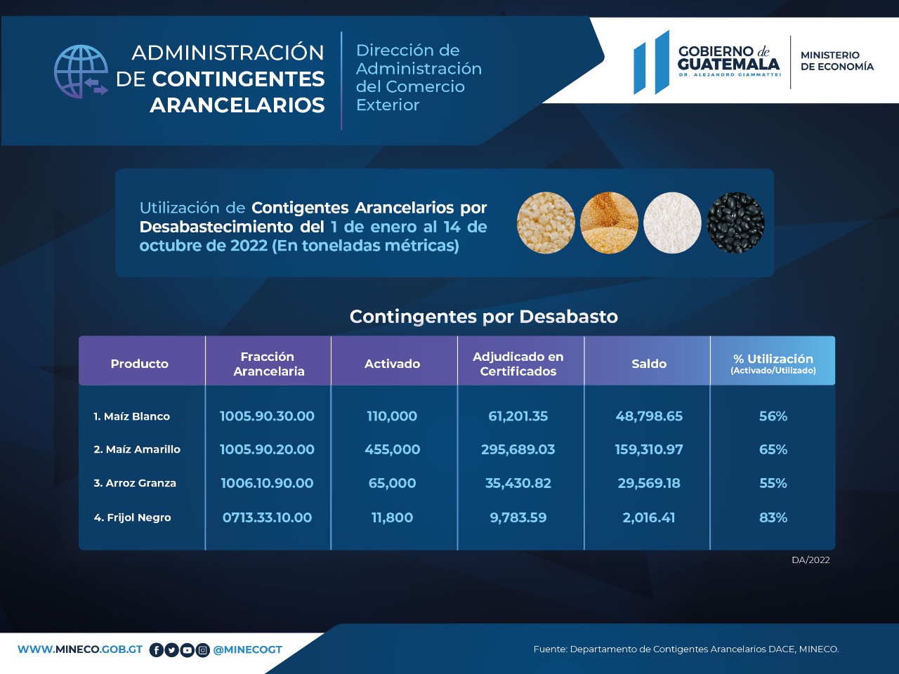 De acuerdo con información de la Administración de Contingentes Arancelarios de la Dirección de Administración del Comercio Exterior (DACE) del Ministerio de Economía, hasta el 14 de octubre último, se han adjudicado 9,783.59 toneladas de frijol negro, equivalente al 83% del monto asignado.