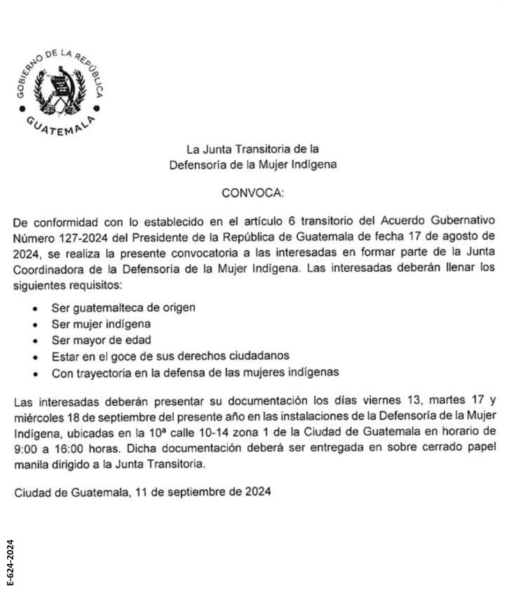 Durante su primera reunión, la Junta Transitoria estableció los lineamientos y fechas para la convocatoria pública dirigida a las interesadas en formar parte de la Junta Coordinadora de la DEMI. Esta Junta Transitoria está conformada por representantes de mujeres y organizaciones de mujeres indígenas, seleccionadas por el presidente Bernardo Arévalo, para el efecto. Este día se hizo pública la convocatoria con los requisitos para recibir los expedientes de las candidatas a integrar la Junta Coordinadora, en el Diario de Centroamérica.