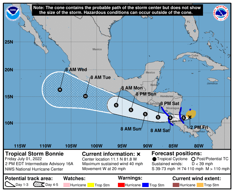 De acuerdo con el Boletín Meteorológico Informativo No. 026-2022, emitido por el Instituto Nacional de Sismología, Vulcanología, Meteorología e Hidrología -INSIVUMEH- a las 13:00 horas del viernes 01 de julio de 2022, se mantiene el monitoreo a la Tormenta Tropical Bonnie ubicada al norte de Panamá.