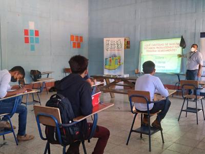 En el Instituto de Desarrollo Comunitario INDRI, comunidad La Esperanza, municipio de La Libertad, la delegación dio detalles de la nueva normativa a 110 estudiantes de nivel básico y diversificado.