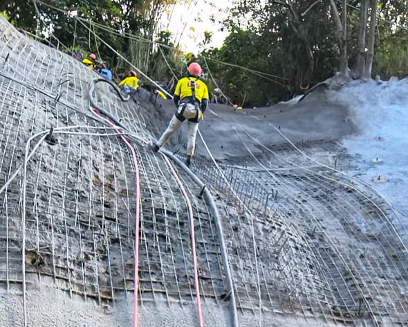 Ahora se continúa con el lanzamiento de concreto de alta resistencia en el área restante. Quedan pendientes la construcción de contracunetas en la corona del talud y la instalación de disipadores de agua pluvial, obras que permitirán conducir de forma controlada las lluvias hacia la cuneta y evitar futuras afectaciones por saturación de humedad.