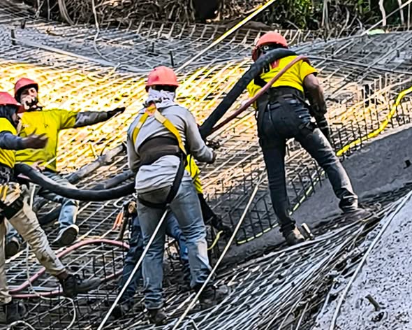 Como parte de la protección de los taludes, se realiza la fundición del muro de contención, con concreto de alta resistencia. Estos trabajos son realizado mediante la Unidad Ejecutora de Conservación Vial (Covial), la cual ha trabajado para habilitar el paso en el kilómetro 11.5 de la ruta RD-GUA-01-01, que conecta la Avenida Hincapié, en la zona 13 capitalina, con Boca del Monte, Villa Canales.