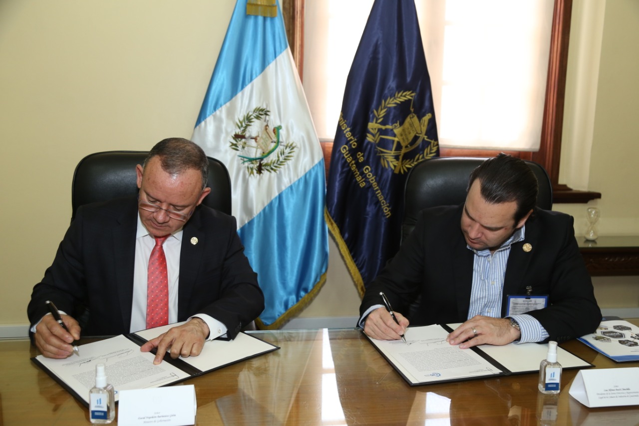 El titular de la cartera del Interior, David Napoleón Barrientos, junto al presidente de la Cámara de Industria de Guatemala (CIG), Luis Alfonso Bosch, firmó el Convenio de Cooperación Técnica para el Fortalecimiento de Acciones Contra el Comercio Ilícito, con el objetivo de fortalecer las acciones en contra de este delito.