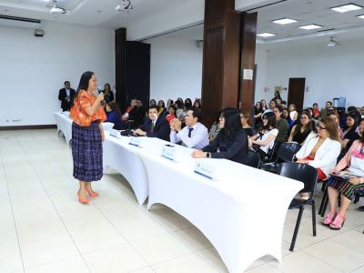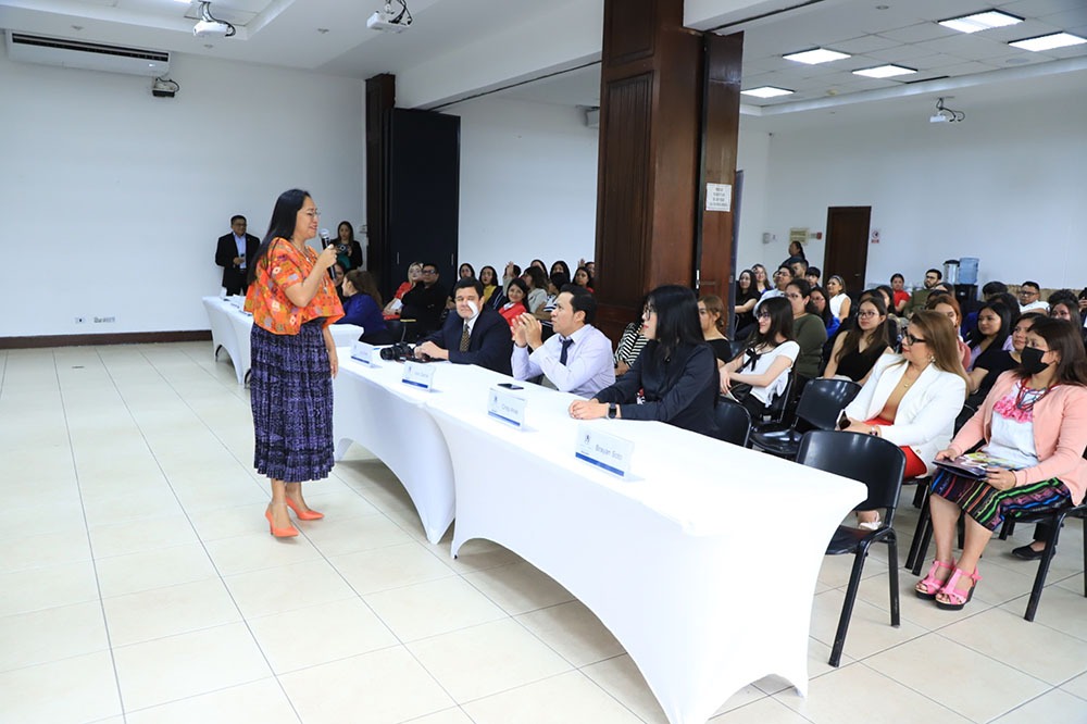 La viceministra de Educación Bilingüe e Intercultural, Romelia Mó Isem, participó en un conversatorio con los estudiantes de la Facultad de Ciencias Jurídicas y Sociales de la Universidad Mariano Gálvez, actividad realizada el martes 22 de abril del presente año en el Marco de la Conmemoración del Acuerdo sobre Identidad y Derecho de los Pueblos Indígenas.