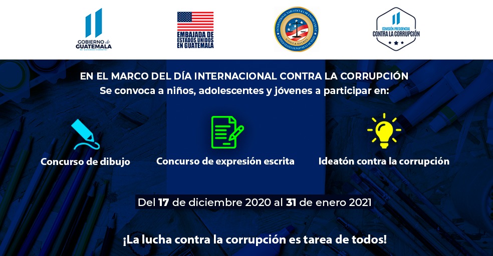 La Comisión Presidencial Contra la Corrupción (CPCC), con el apoyo de la Embajada de los Estados Unidos en Guatemala, por medio de la Oficina Internacional para Asuntos Antinarcóticos y Aplicación de la Ley, lanza la convocatoria a participar en tres concursos en el marco del Día Internacional contra la Corrupción.