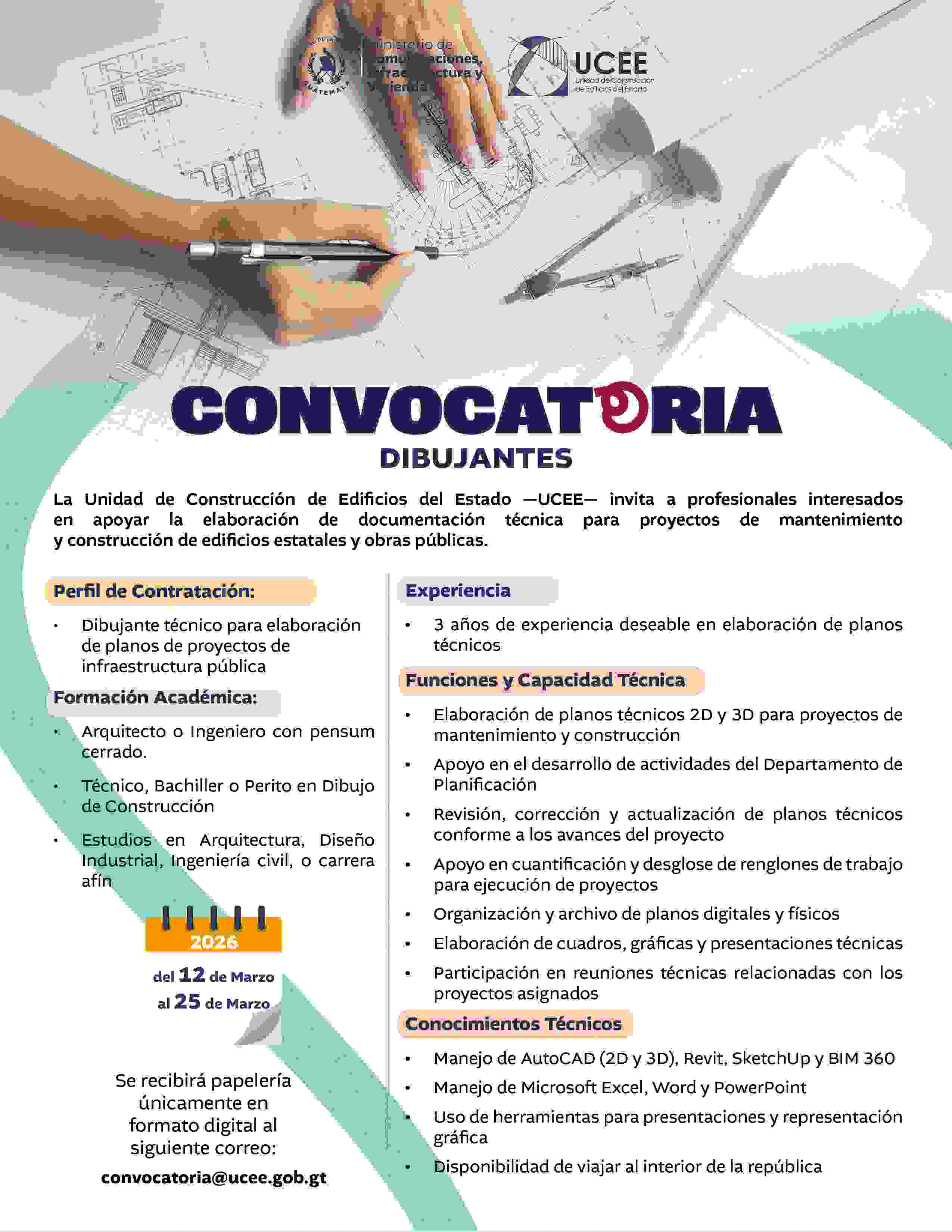 La Unidad de Construcción de Edificios del Estado (UCEE) invita a profesionales interesados a participar en la convocatoria para aplicar como Dibujante, y formar parte de los proyectos de mantenimiento y construcción de edificios estatales y obras públicas.