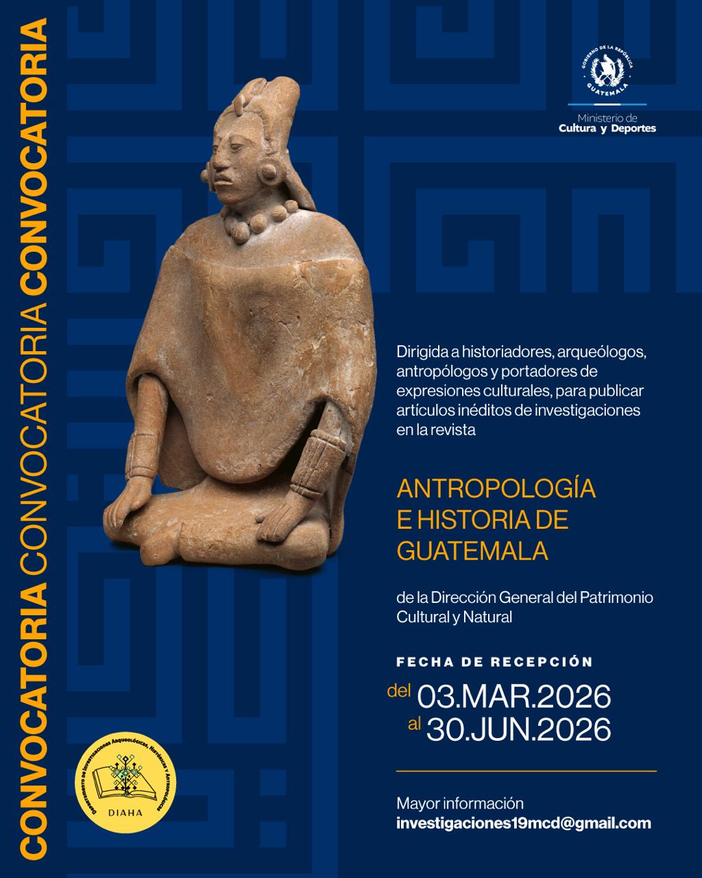 La revista Antropología e Historia de Guatemala, de la Dirección General del Patrimonio Cultural y Natural, invita a historiadores, arqueólogos, antropólogos y portadores de expresiones culturales a publicar artículos inéditos de investigación.