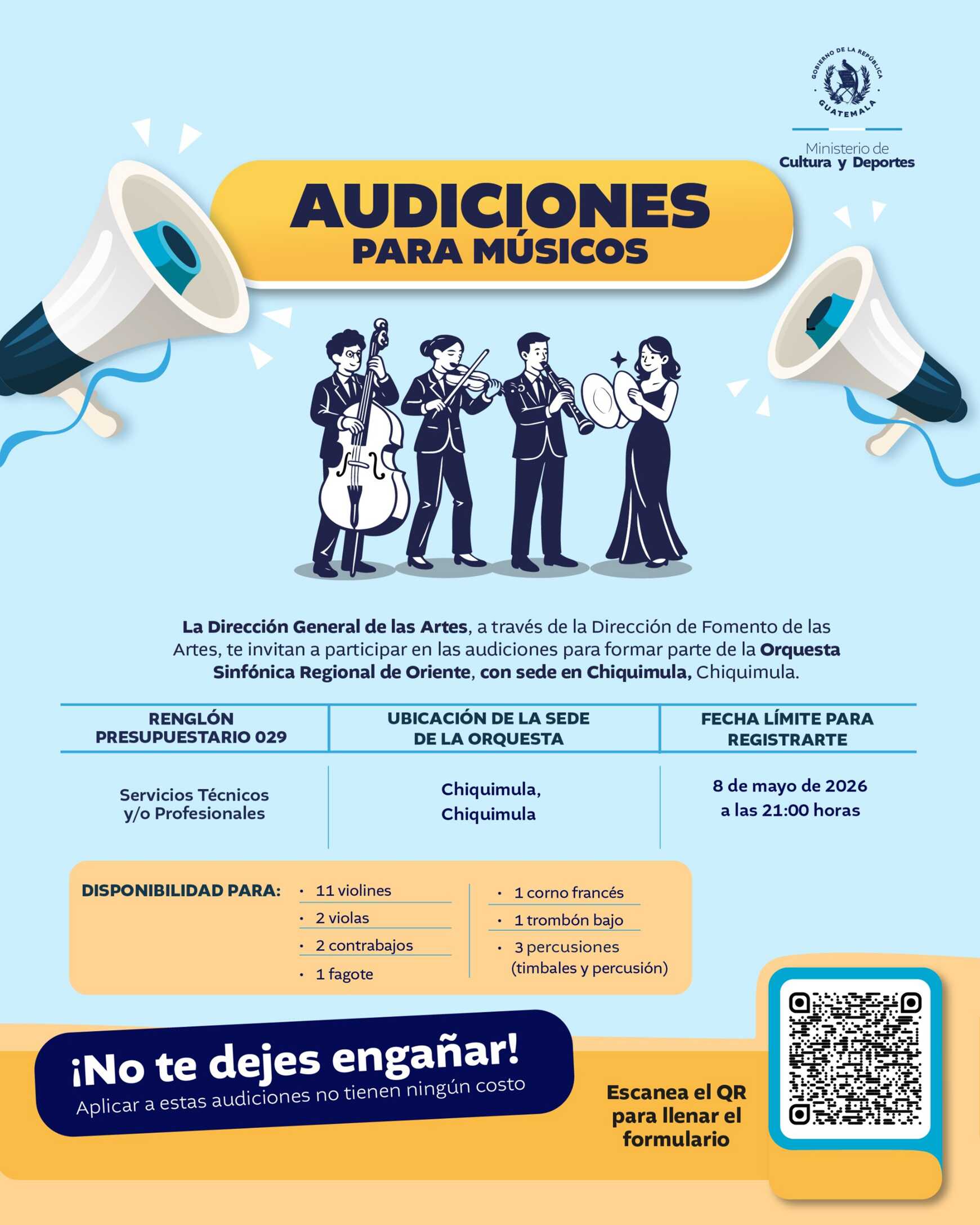 Una nueva oportunidad para formar parte de esta agrupación se abre con las audiciones que se realizarán el próximo 11 de mayo, de 9:00 a. m. a 12:00 p. m., en el Conservatorio Nacional de Música “Germán Alcántara”, ubicado en la zona 1 de la Ciudad de Guatemala. En esta ocasión, la convocatoria está dirigida a intérpretes de instrumentos específicos necesarios para completar la conformación de la orquesta.