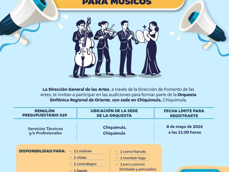 La Dirección de Fomento de las Artes realizará nuevamente audiciones dirigidas a músicos especializados en instrumentos específicos, quienes podrán integrarse a la Orquesta Sinfónica Regional de Oriente, con sede en Chiquimula.