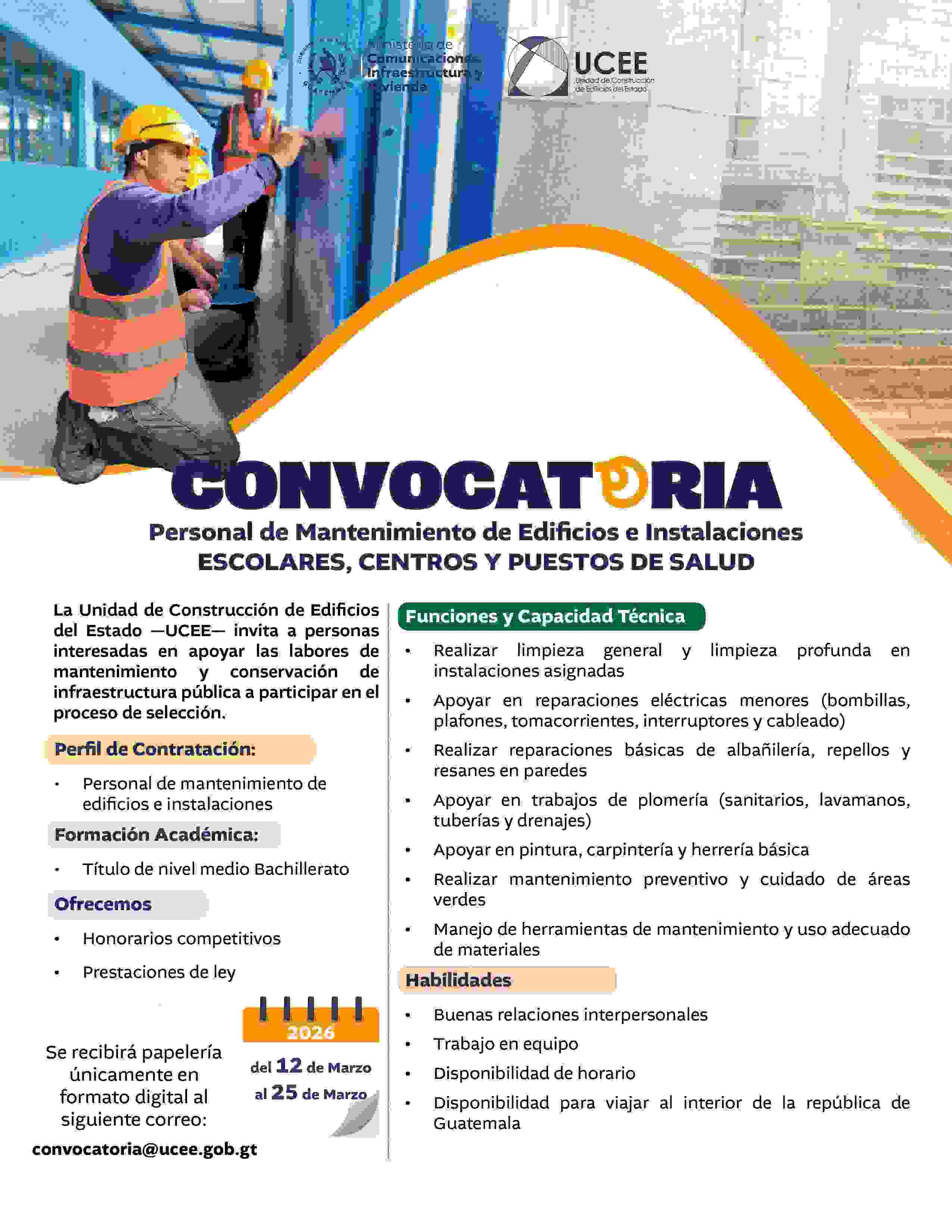 La Unidad de Construcción de Edificios del Estado (UCEE) invita a participar en la convocatoria para aplicar como Personal de Mantenimiento de Edificios e Instalaciones, para apoyar labores en centros educativos, centros y puestos de salud en distintas regiones del país.
