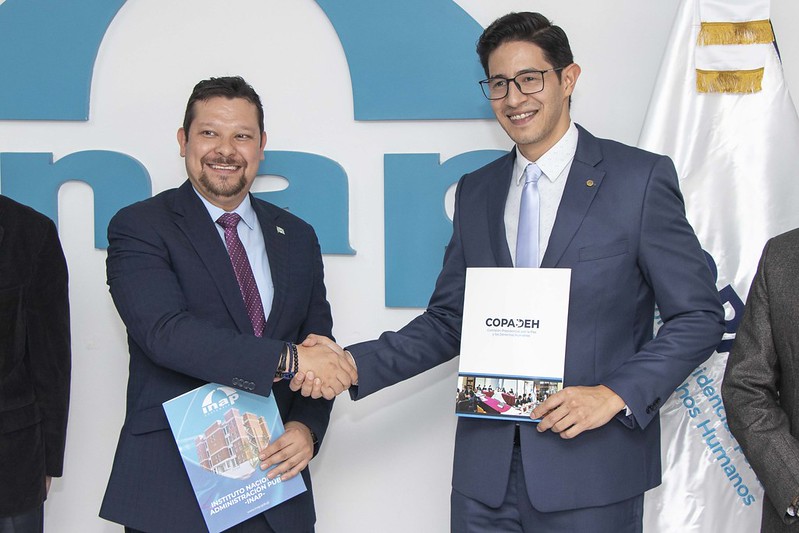 Con la suscripción de un convenio de cooperación interinstitucional, el director ejecutivo de la Comisión Presidencial por la Paz y los Derechos Humanos -COPADEH- Ramiro Alejando Contreras Escobar y el gerente del Instituto Nacional de Administración Pública -INAP- Alvaro Díaz Coronado, oficializaron la alianza estratégica que tiene como objetivo facilitar la implementación de un plan de formación y capacitación en materia de Derechos Humanos y el fomento de la cultura de paz.