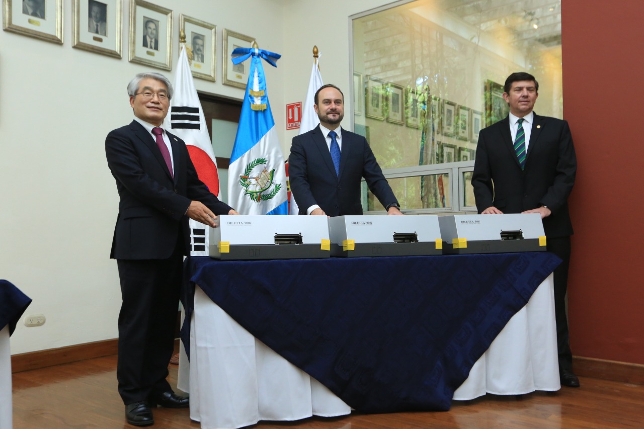 El acto, en el que también participó el director general del IGM, Manuel Estuardo Rodríguez Valladares, estuvo presidido por el Ministro de Relaciones Exteriores, Pedro Brolo Vila, quien agradeció al embajador de Corea acreditado en Guatemala, Seok Hwa Hong, por la positiva respuesta a las gestiones de la Cancillería para obtener las impresoras, y por la entrega de las mismas.