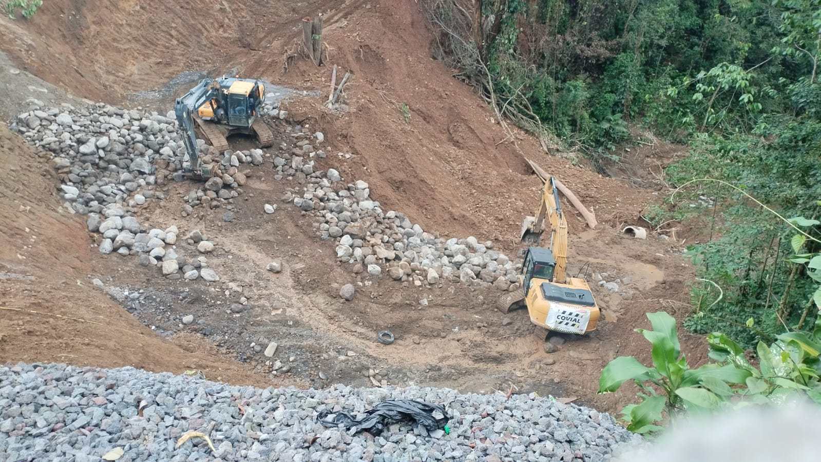 La emergencia fue ocasionada por las fuertes lluvias que saturaron el suelo y provocaron el colapso parcial de la plataforma. En respuesta, Covial realizó primero la captación de nacimientos de agua, para desviar adecuadamente los flujos subterráneos y evitar que continúen debilitando la estructura del camino.