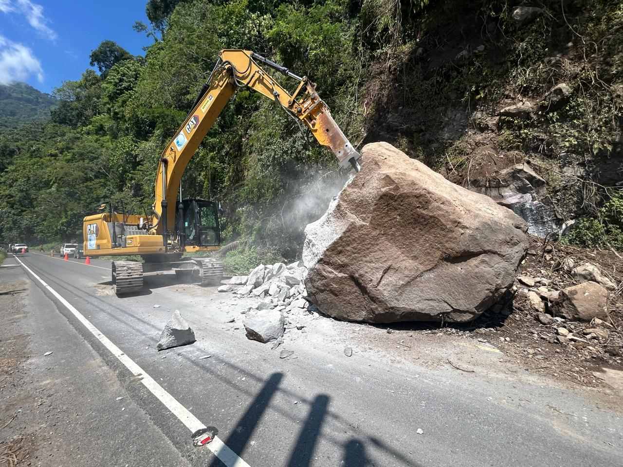 La Unidad Ejecutora de Conservación Vial (Covial) del Ministerio de Comunicaciones, Infraestructura y Vivienda ejecuta acciones de emergencia en el km 91 de la ruta RN-16, en jurisdicción de Chiquimulilla, Santa Rosa, donde el fin de semana se registró un desprendimiento de roca de gran tamaño que bloqueó el carril con dirección hacia Chiquimulilla.