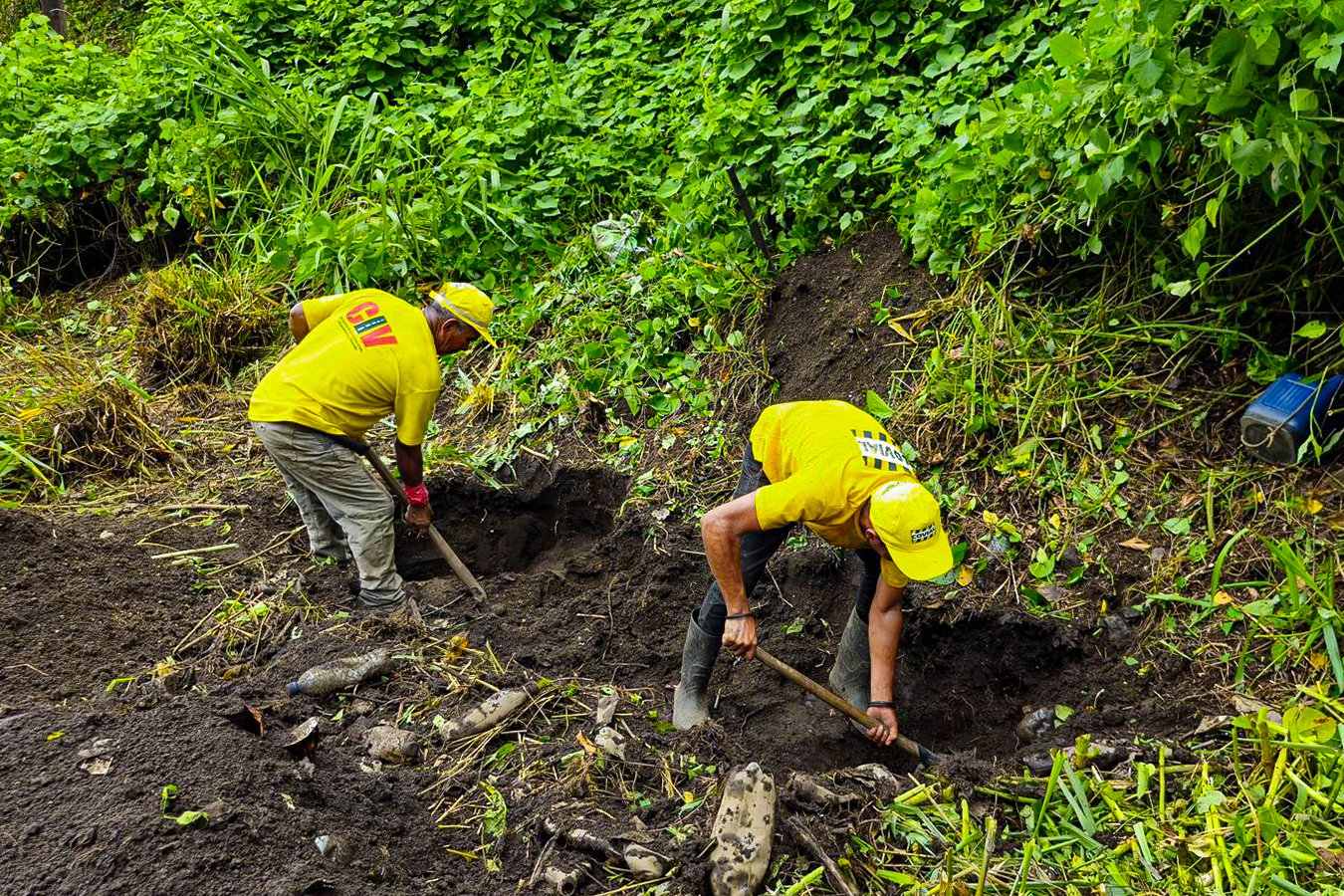 Una cuadrilla de trabajadores realiza la limpieza profunda de una cuneta completamente azolvada, lo cual es esencial para garantizar que el agua pluvial drene correctamente y no se acumule sobre la superficie de rodamiento.