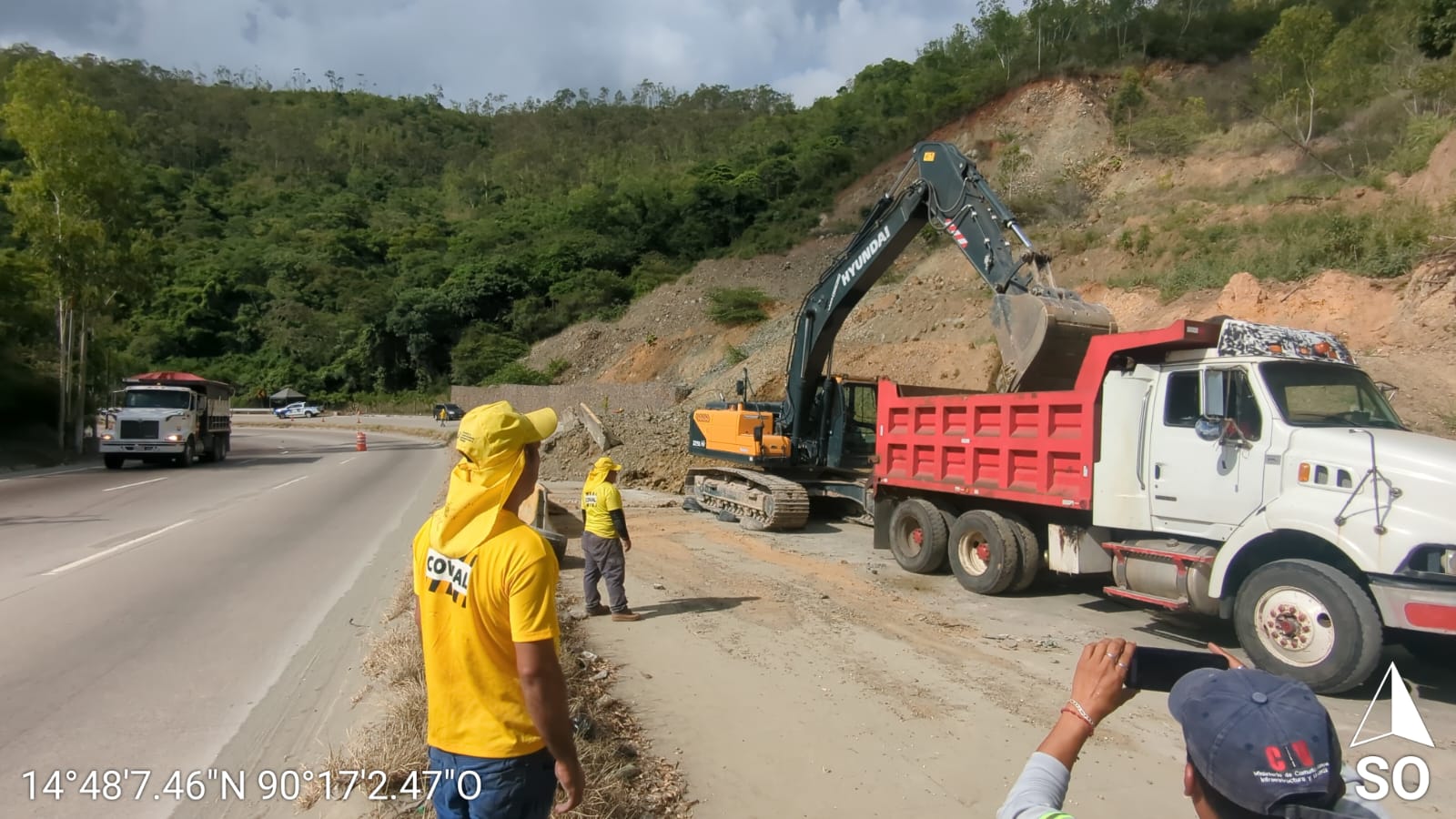 La Unidad Ejecutora de Conservación Vial (Covial) trabaja en el retiro de un derrumbe de grandes proporciones que afecta los carriles del lado derecho de la CA-9 Norte, con dirección al oriente del país, específicamente en el kilómetro 43.2.
