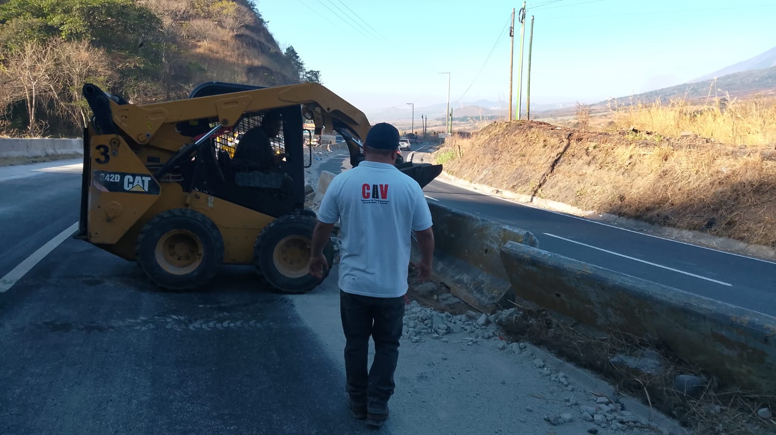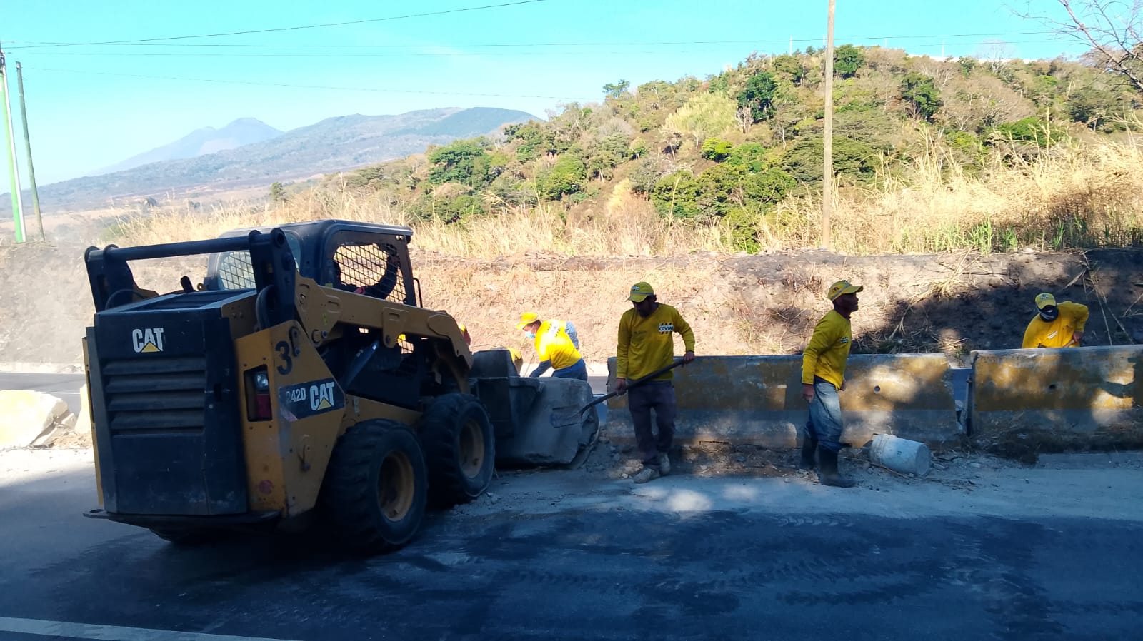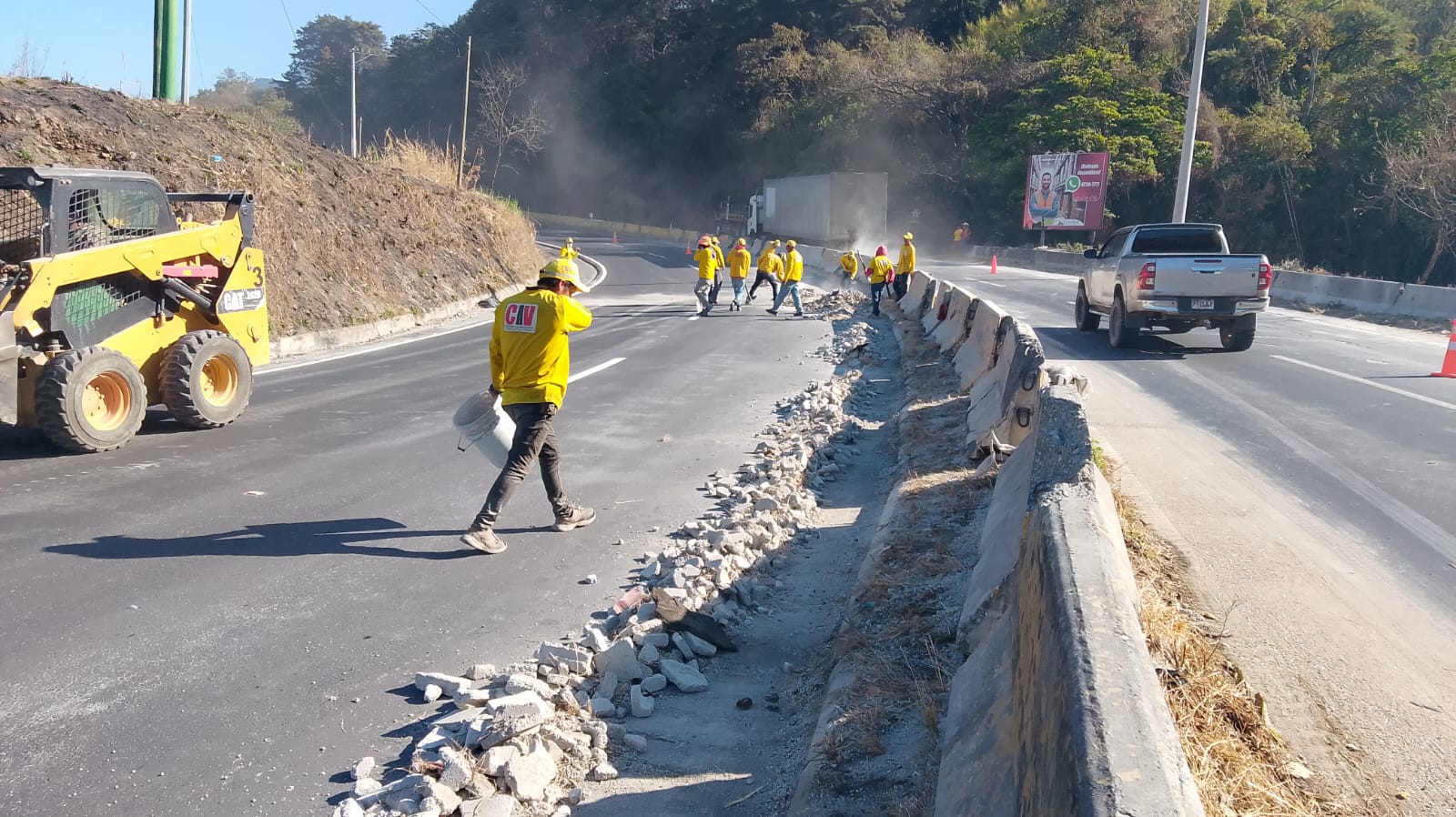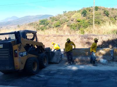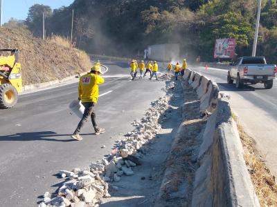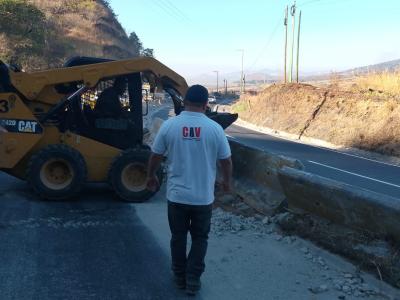 Tras una fuerte colisión en el km 33 de la ruta a El Salvador, en el área conocida como Vuelta del Chilero, ocurrida ayer, el Ministerio de Comunicaciones, Infraestructura y Vivienda (CIV) a través de la Unidad Ejecutora de Conservación Vial (COVIAL) trabaja en el lugar en la limpieza de la carretera y el retiro de escombros para liberar el paso del tránsito