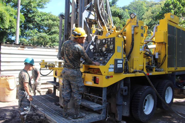 El Cuerpo de Ingenieros del Ejército "Teniente Coronel de Ingenieros e Ingeniero Francisco Vela Arango", a través del personal del Primer Batallón de Ingenieros de Construcción, realiza la perforación de un pozo mecánico de agua potable, el cual beneficiará a vecinos de la aldea los Izotes, en el municipio de Nueva Santa Rosa, Santa Rosa.