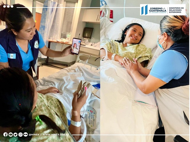 De igual manera, como parte de las acciones consulares del Minex, se visitó a la connacional Yenifer Yulisa Cardona Tomás, de 20 años, quien evoluciona favorablemente en un centro médico y presenta buen estado de ánimo. En el lugar se le brindó orientación legal y migratoria y se efectuó una videoconferencia con sus padres y hermanos en Guatemala. En los próximos días se espera que sea dada de alta.