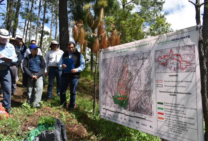 Posteriormente, se visitó el sendero ecológico El Aprisco, en Totonicapán donde implementan acciones a nivel comunitario para la construcción de capacidades locales en la preparación y respuesta ante fenómenos climáticos. Estos esfuerzos contribuyen directamente al fortalecimiento de redes comunitarias resilientes en alianza estratégica con Unión Internacional para la Conservación de la Naturaleza -UICN-.