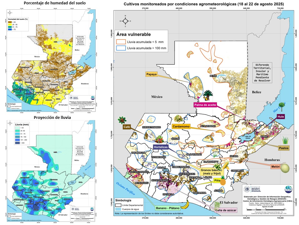 Las condiciones meteorológicas para esta semana, del 18 al 22 de agosto, el Ministerio de Agricultura, Ganadería y Alimentación (MAGA) informa que se mantiene un monitoreo en 247 municipios de los 22 departamentos del país, pues de acuerdo con el pronóstico emitido por el Instituto Nacional de Sismología, Vulcanología, Meteorología e Hidrología (INSIVUMEH), existe un déficit de humedad.