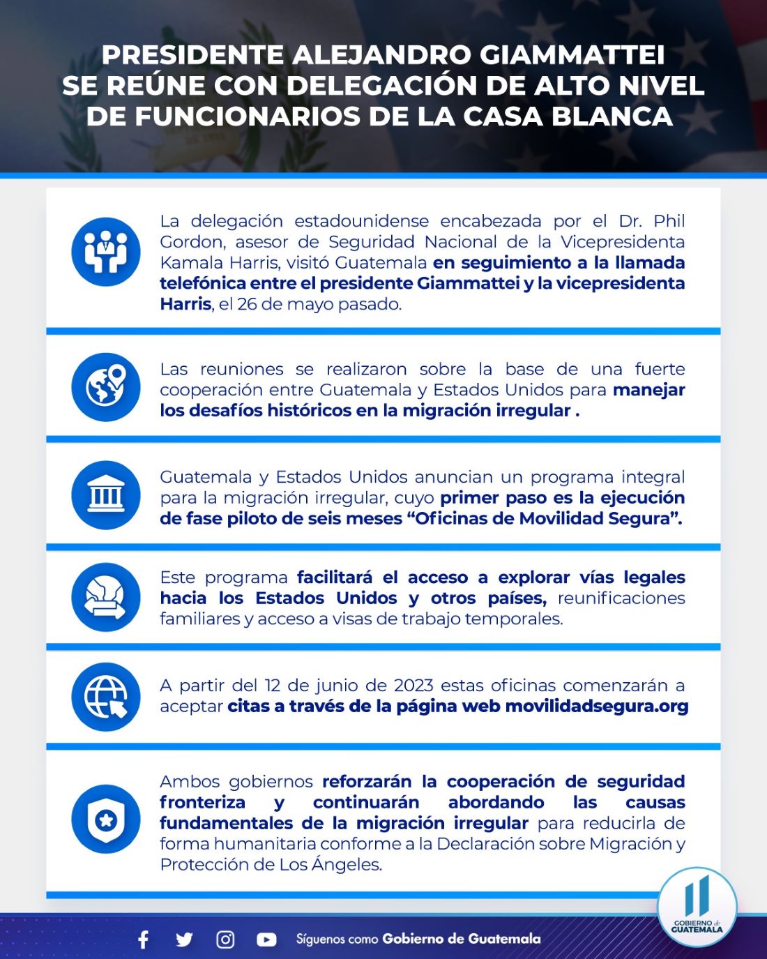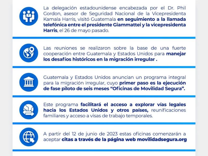 Guatemala y los Estados Unidos de América anuncian un programa integral para la migración irregular, incluyendo como primer paso la ejecución de la fase piloto de seis meses “Oficinas de Movilidad Segura”. Este programa facilitará el acceso a vías legales hacia los Estados Unidos y otros países, reunificaciones familiares y acceso a visas de trabajo temporales. A partir del 12 de junio de 2023, estas oficinas comenzarán a aceptar citas, a través de la página web movilidadsegura.org.