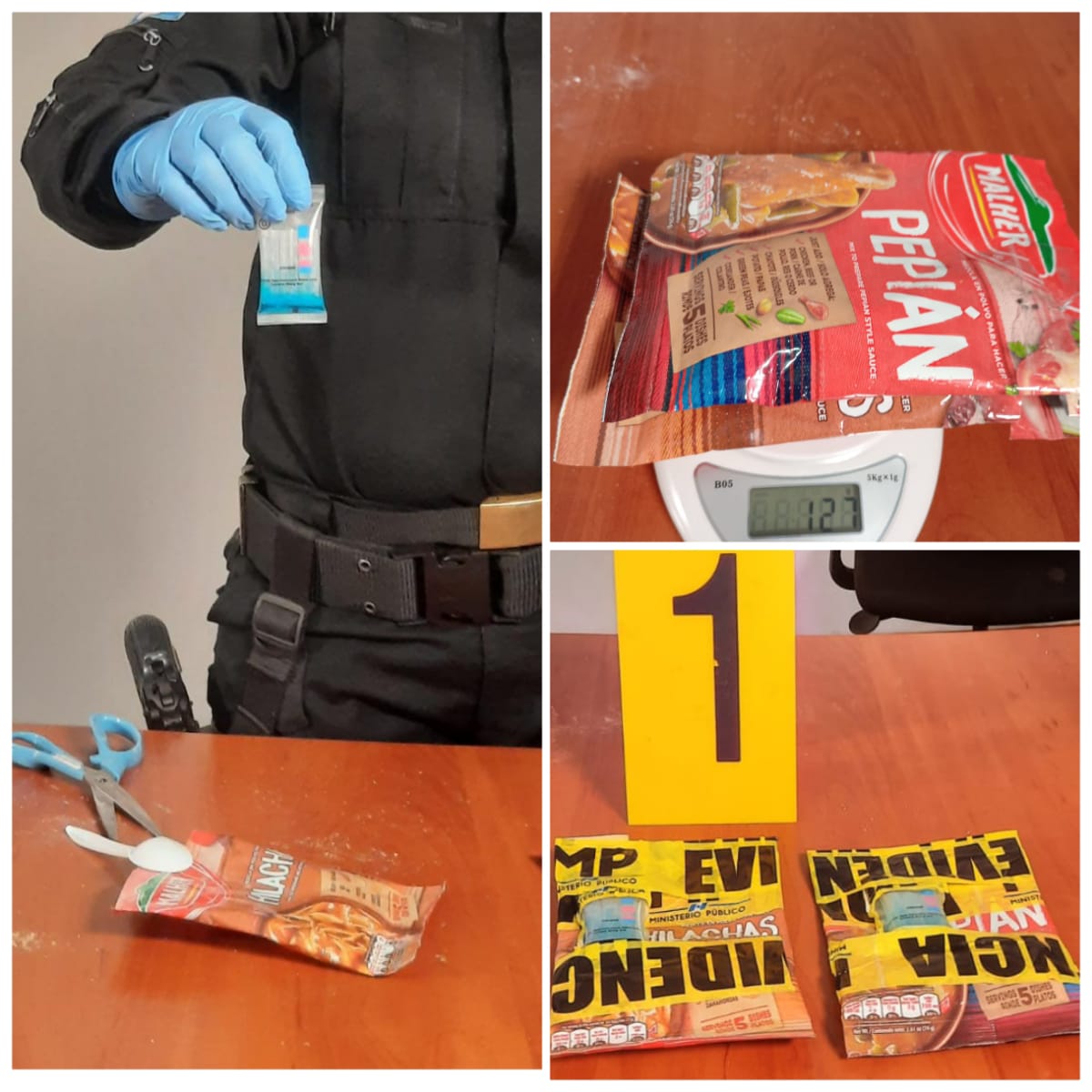 Los policías realizaron la coordinación con fiscales del Ministerio Público (MP), para efectuar las pruebas de campo correspondientes a los envoltorios multicolor localizados dentro de una caja de encomienda, dando como resultado presuntivo positivo para cocaína.