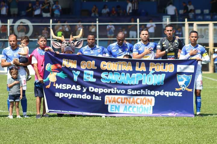 Portando una pancarta colorida y especial, el Deportivo Suchitepéquez se unió a la campaña de Vacunación en Acción, invitando a madres y padres de familia proteger a la niñez de 2 a 5 años contra el sarampión, rubéola, paperas y poliomielitis.